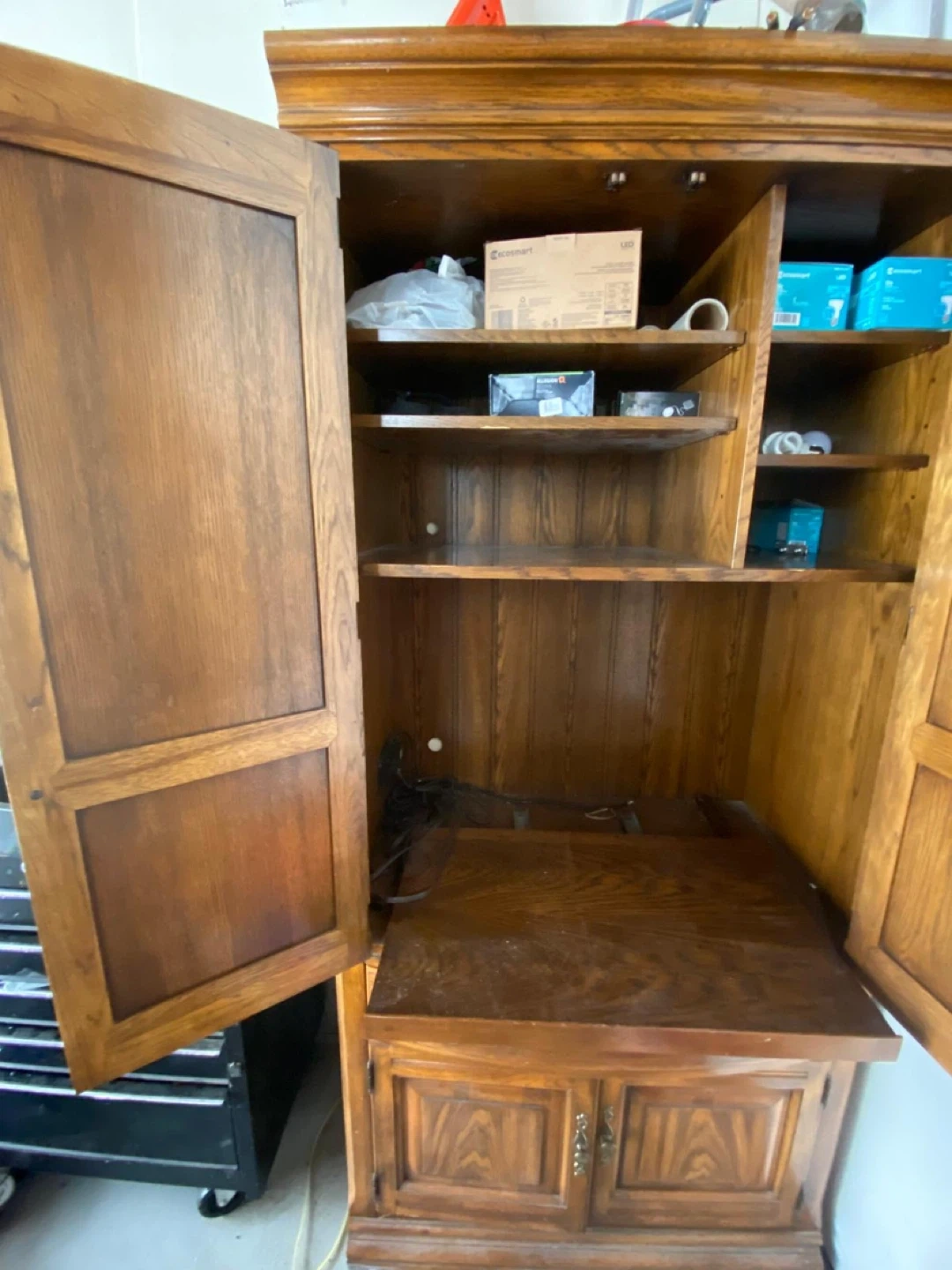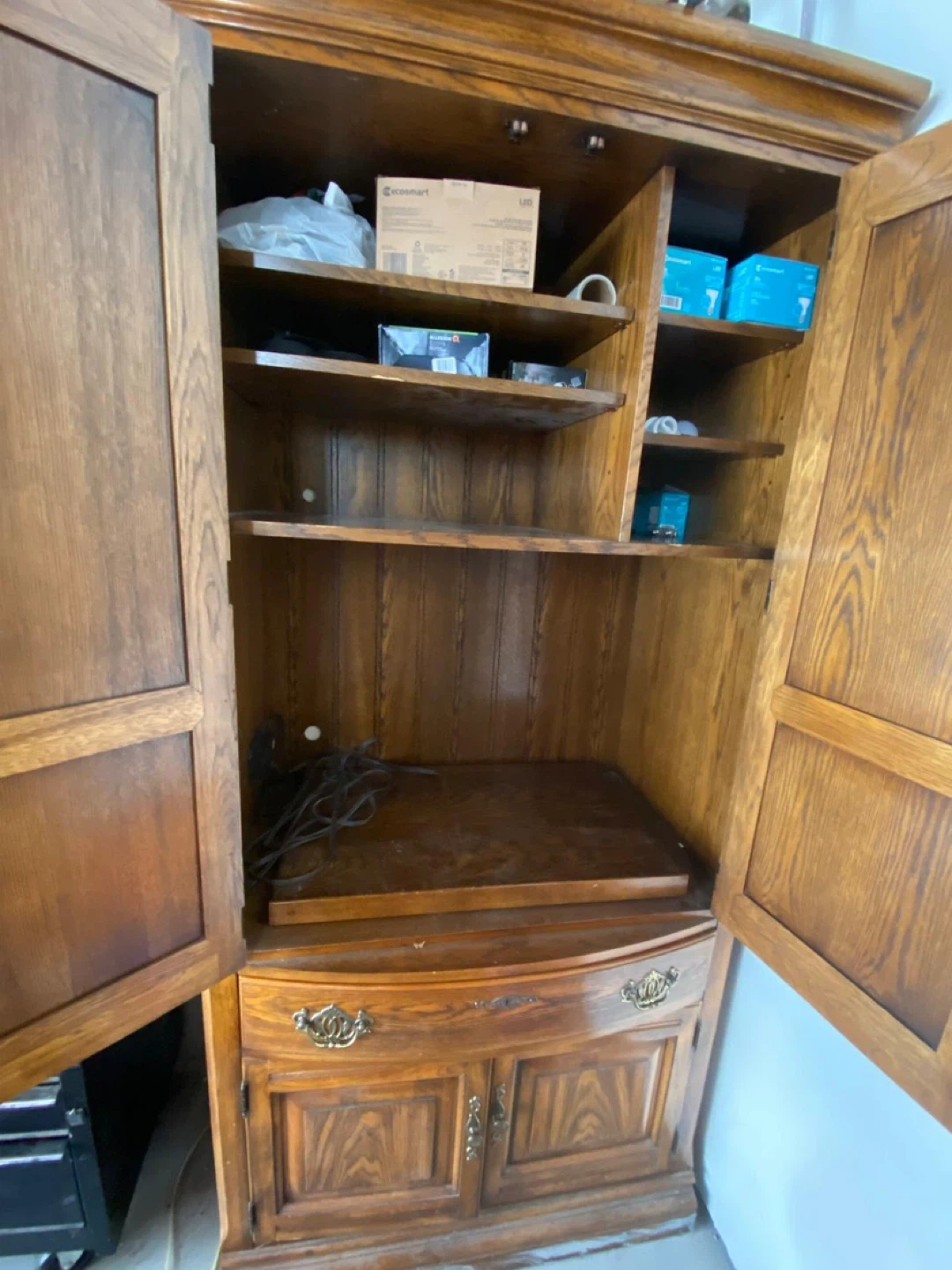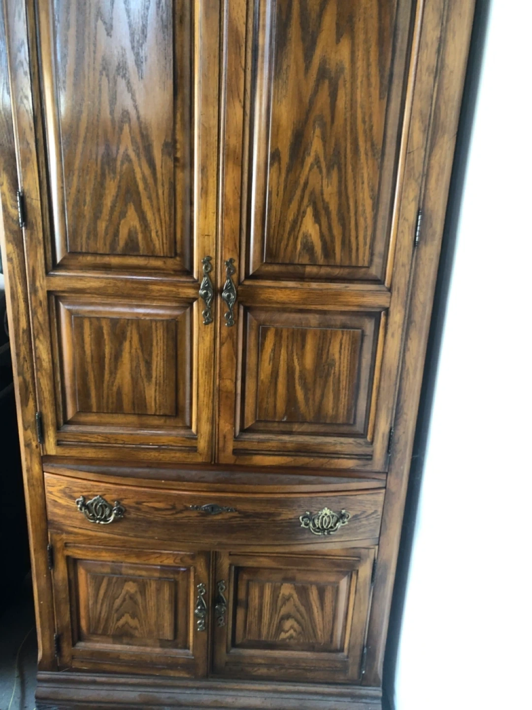 This is a beautiful vintage wooden armoire with classic detailing. It features paneled doors and drawers with ornate hardware. Inside, there are adjustable shelves and ample storage space. It's perfect for storing clothes, linens, or household items and would make a great addition to any room!