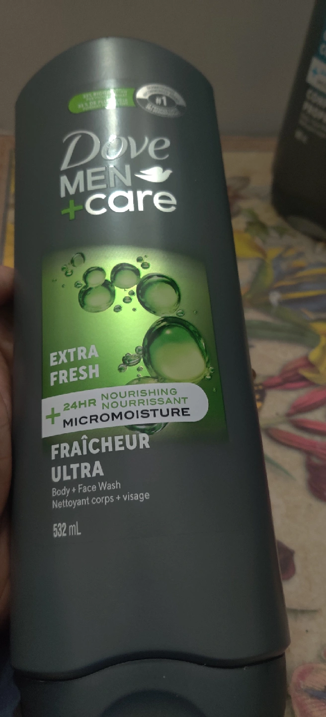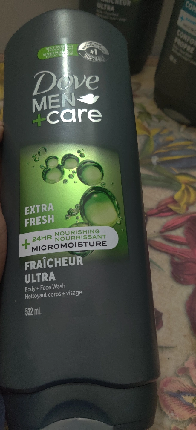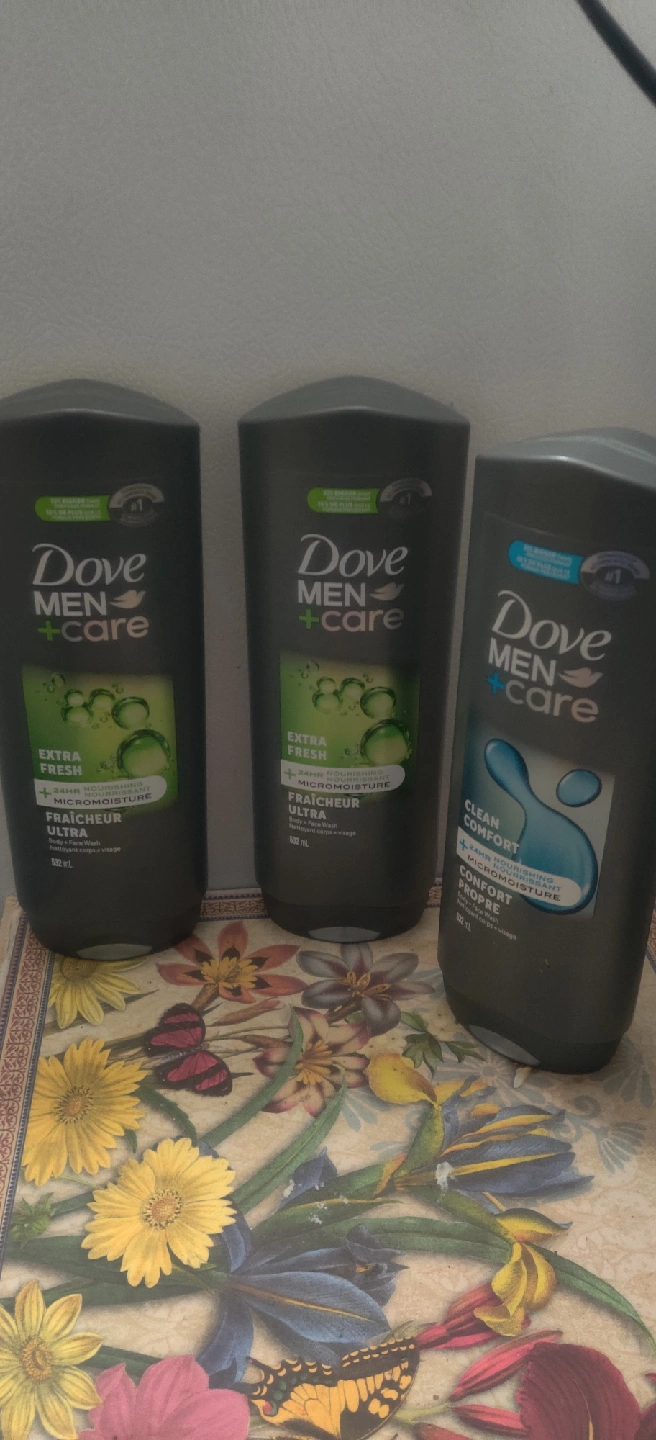 1000+Selling three bottles of Dove Men+Care body wash. One is Clean Comfort and two are Extra Fresh. Each bottle contains 532 mL. They are formulated with 24HR Nourishing Micromoisture technology, leaving skin feeling healthy and hydrated