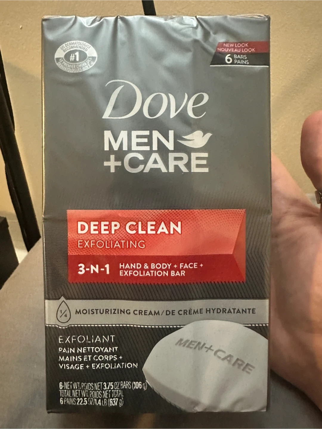 I'm selling a pack of Dove Men+Care Deep Clean Exfoliating 3-N-1 Bar Soap. This pack includes 6 bars. It's a hand, body, and face exfoliation bar with 1/4 moisturizing cream.
