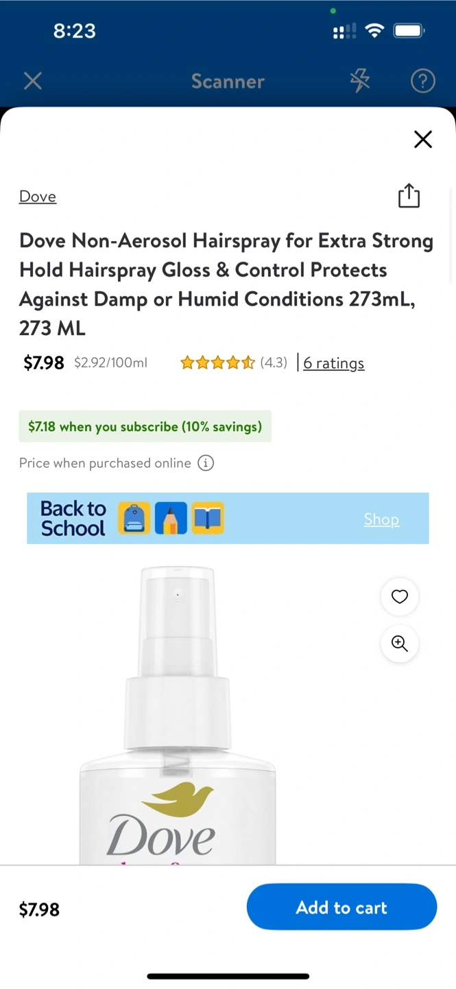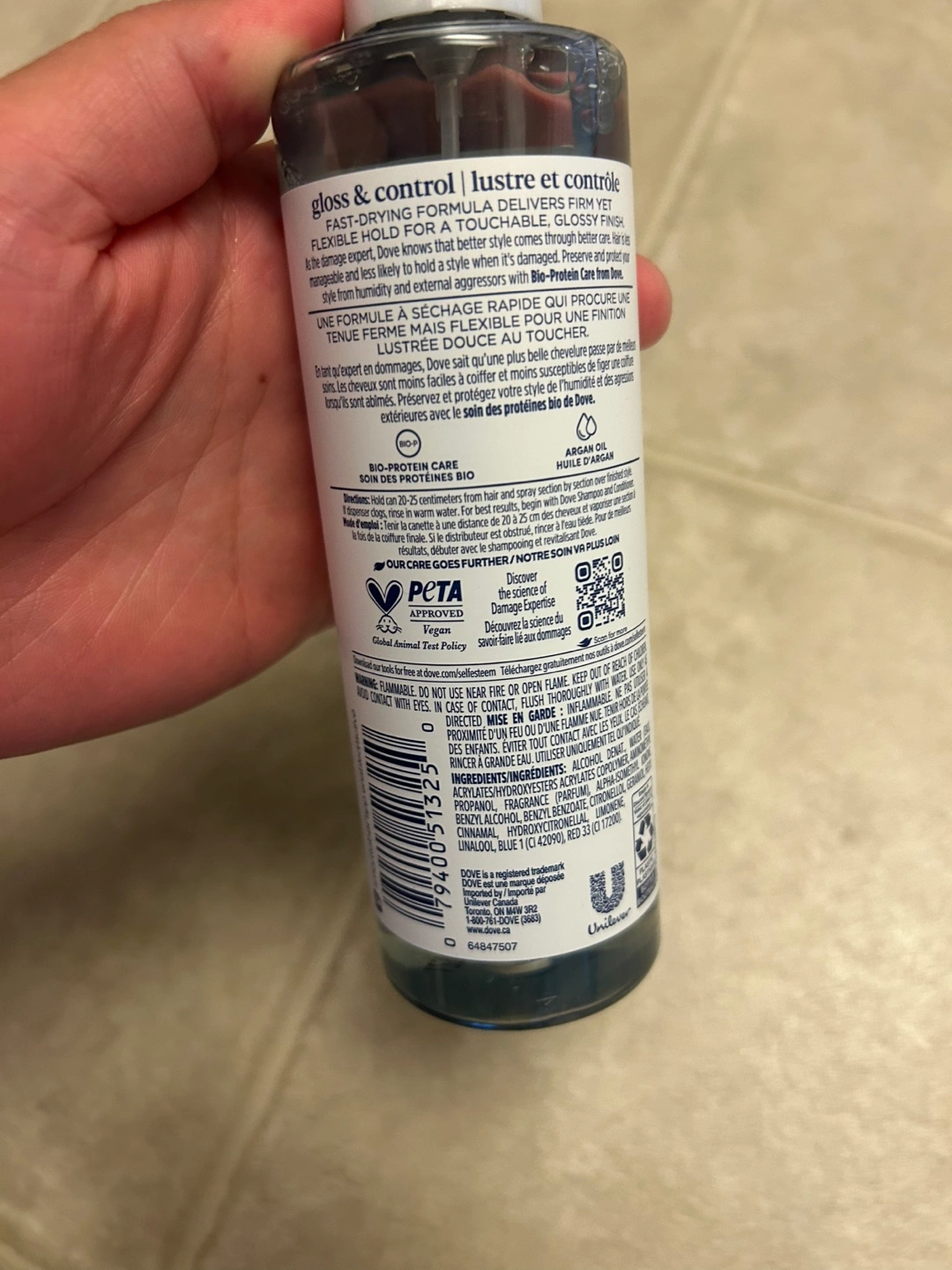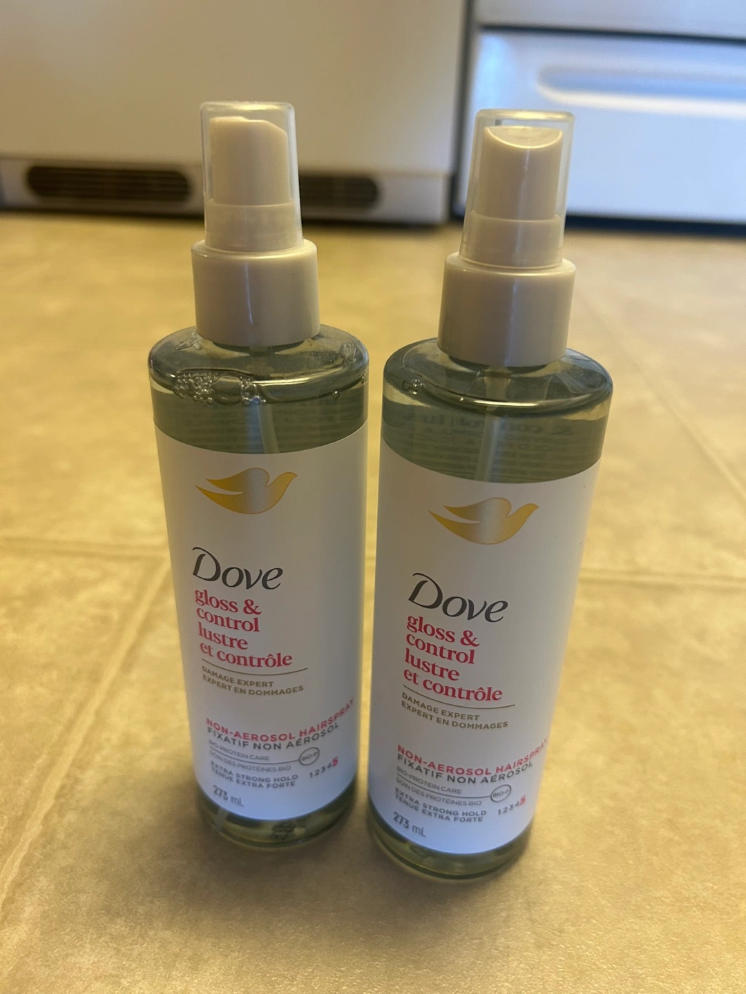 13Selling Dove Non-Aerosol Hairspray for extra strong hold! It protects against damp or humid conditions. Each bottle contains 273 mL of product. Fast-drying formula delivers firm yet flexible hold for a touchable, glossy finish $6 for 1 unite