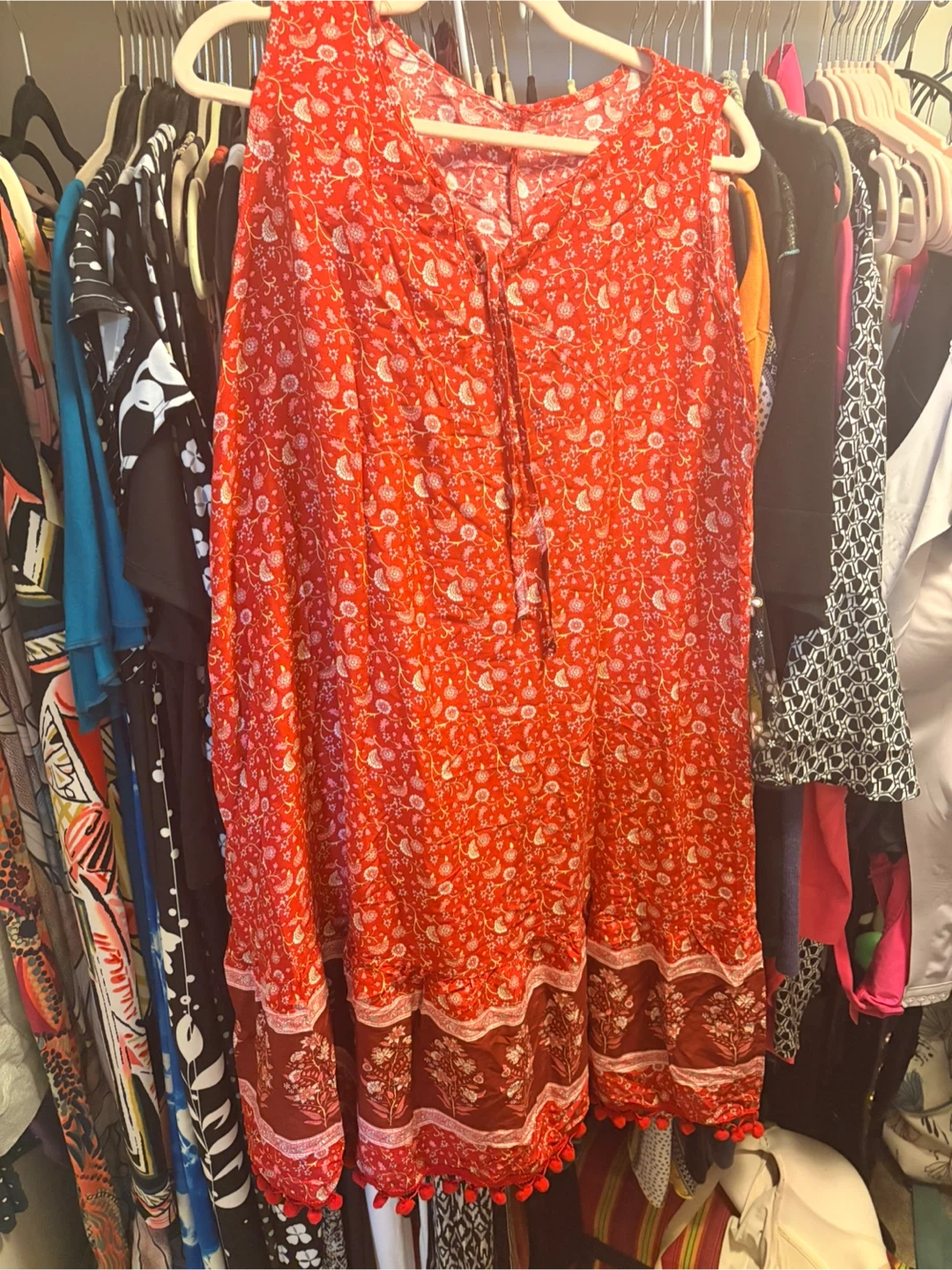 This red boho-style dress features a vibrant floral print with a tie neckline and a playful pom-pom trim. It's made of lightweight fabric, perfect for warm weather. This dress would be a lovely addition to a summer wardrobe!