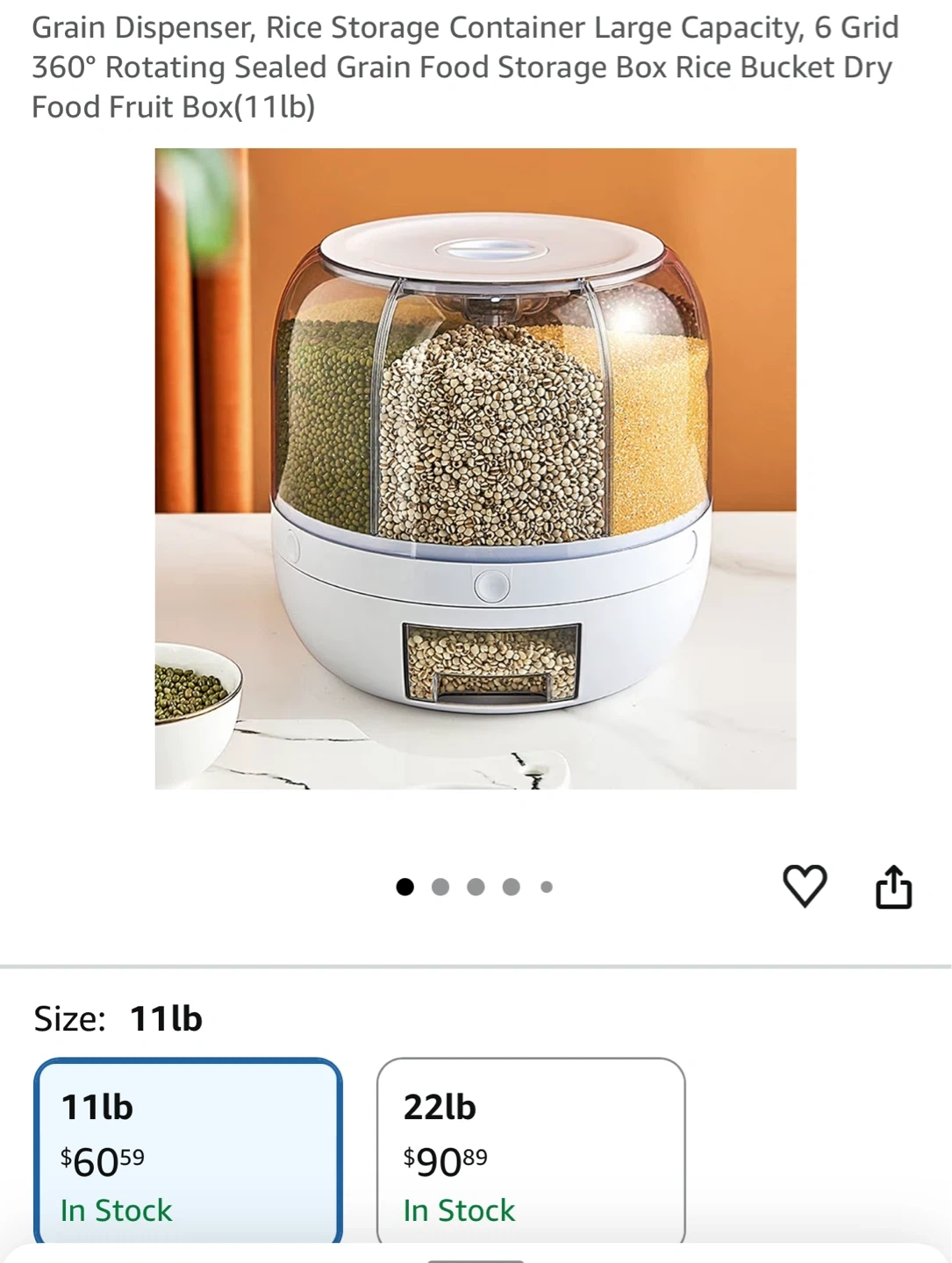 This 11lb rotating grain dispenser has 6 grids for storing different dry foods. It features intelligent quantitative dispensing with just one key press. The rice bucket design makes it easy to load miscellaneous grains.