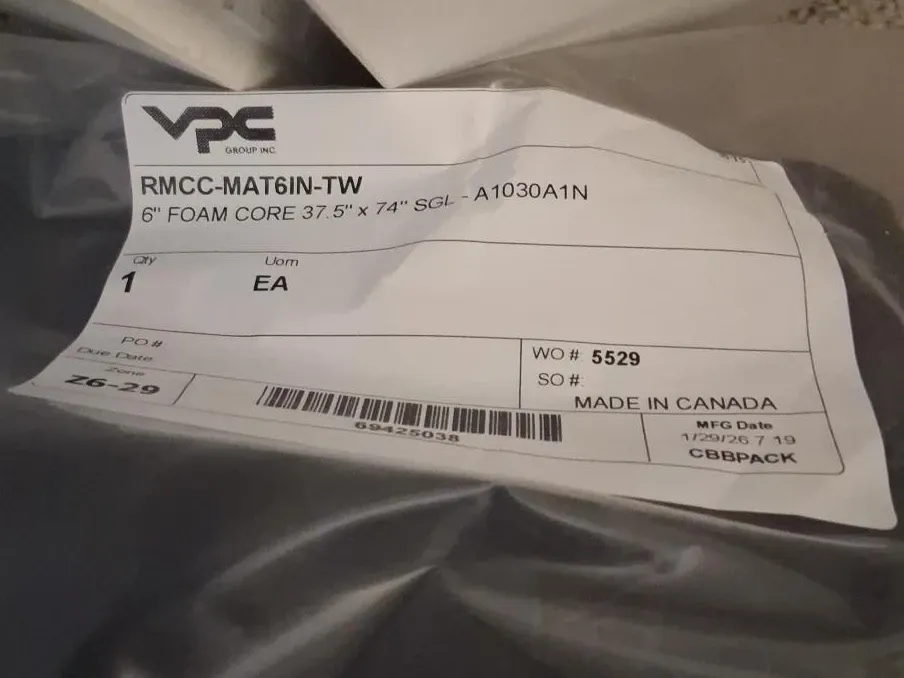 This is a VPC Group Inc. foam core mattress. It's 6" thick with a 37.5" x 74" SGL size. Manufactured in Canada.