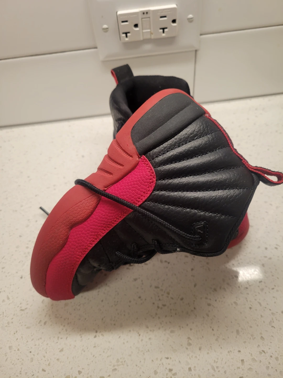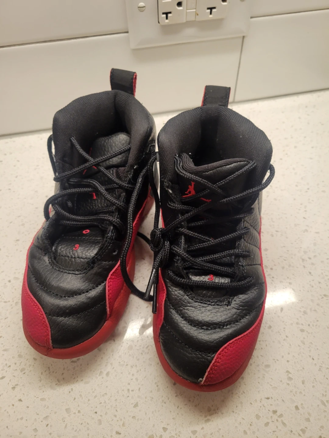 Toddler-sized Air Jordan 12 Retro sneakers in black and red. Leather and synthetic upper. Rubber outsole.