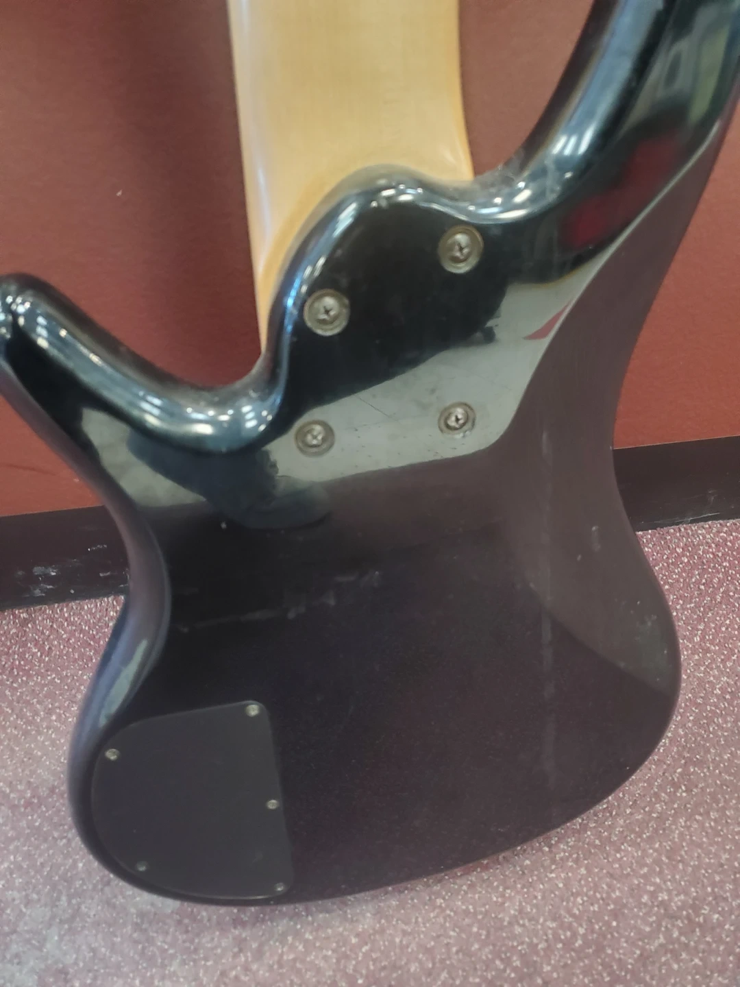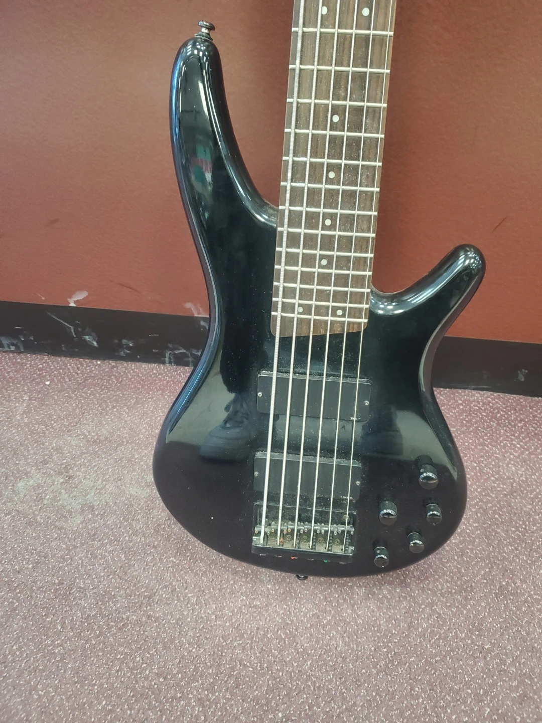 This is a black Ibanez Soundgear bass guitar. It's a 5-string model. This bass would be great for musicians looking for extended range.