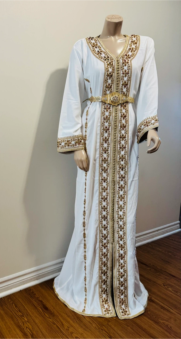 Beautiful white Moroccan kaftan featuring intricate gold embroidery. This elegant piece is perfect for special occasions or adding a touch of cultural flair to your wardrobe. The detailing is stunning, and the fabric drapes beautifully. It comes with a decorative gold belt to cinch the waist. A truly unique and eye-catching garment!