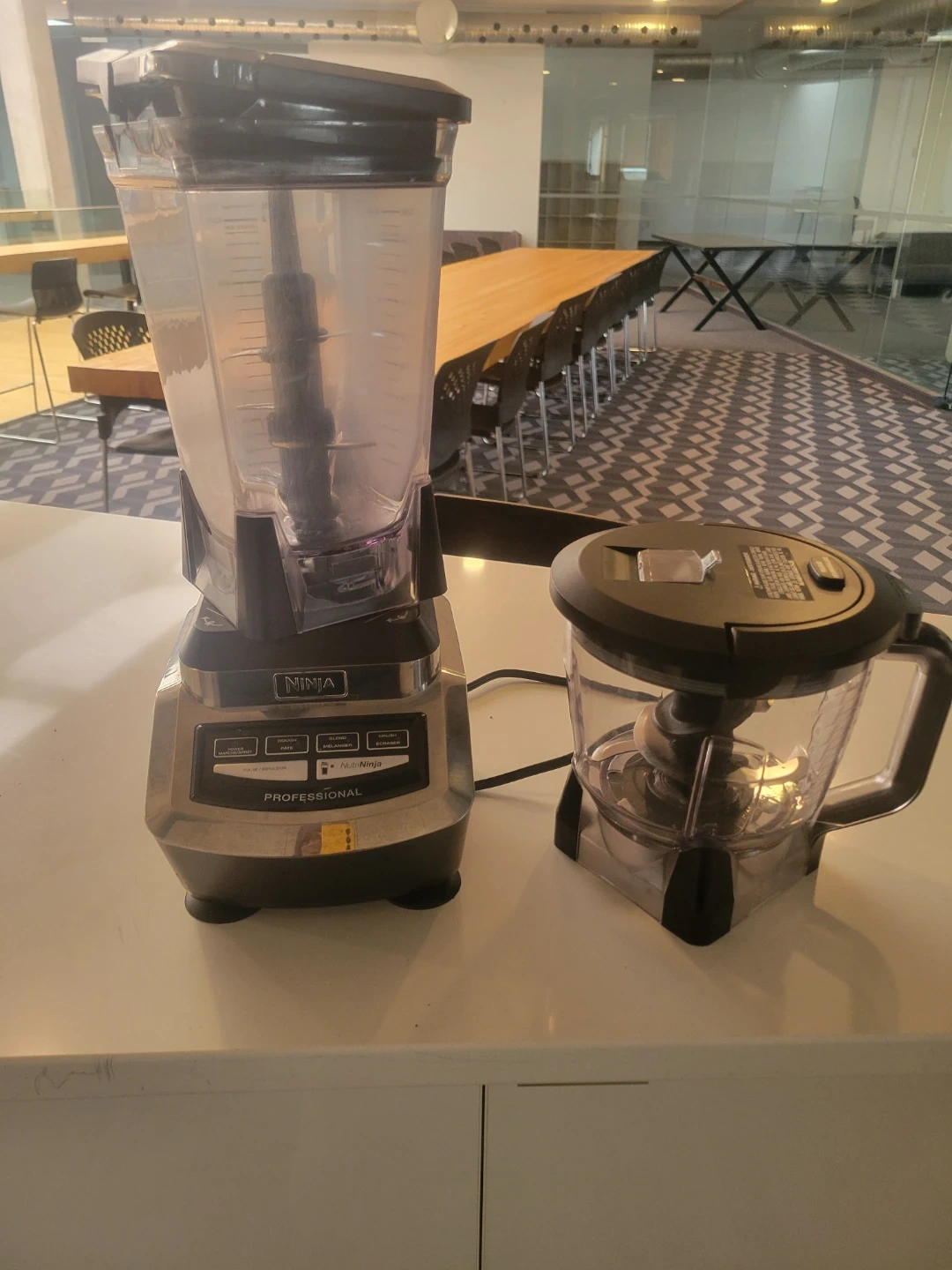 This Ninja Professional blender and food processor comes with its pitcher and processing bowl. It's a powerful appliance for making smoothies and chopping ingredients. Its sleek silver and black design fits well in any kitchen.