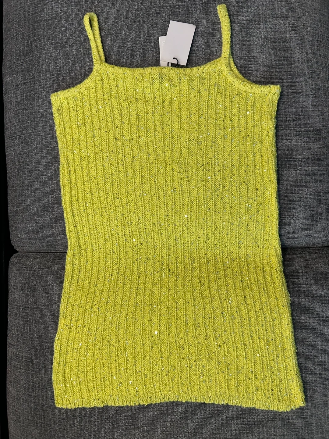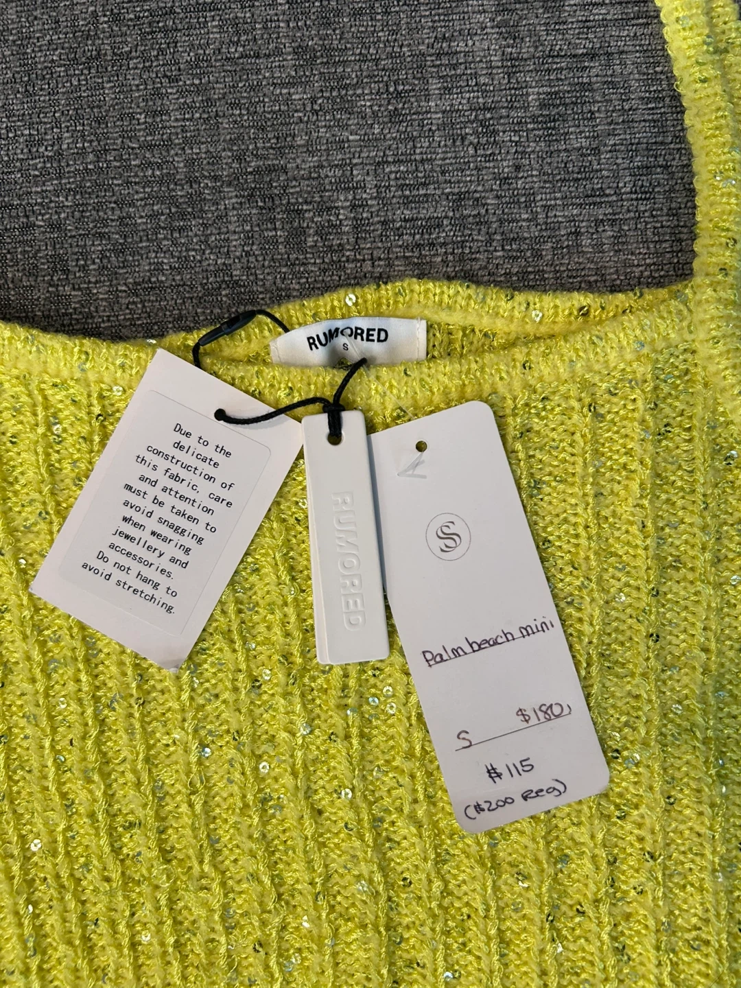 This "Palm Beach Mini" tank top is from Rumored. It features a yellow knit fabric with all-over sequins. Size is S. Original price was $200, I bought it for $115, selling it for $100 firm on my price.