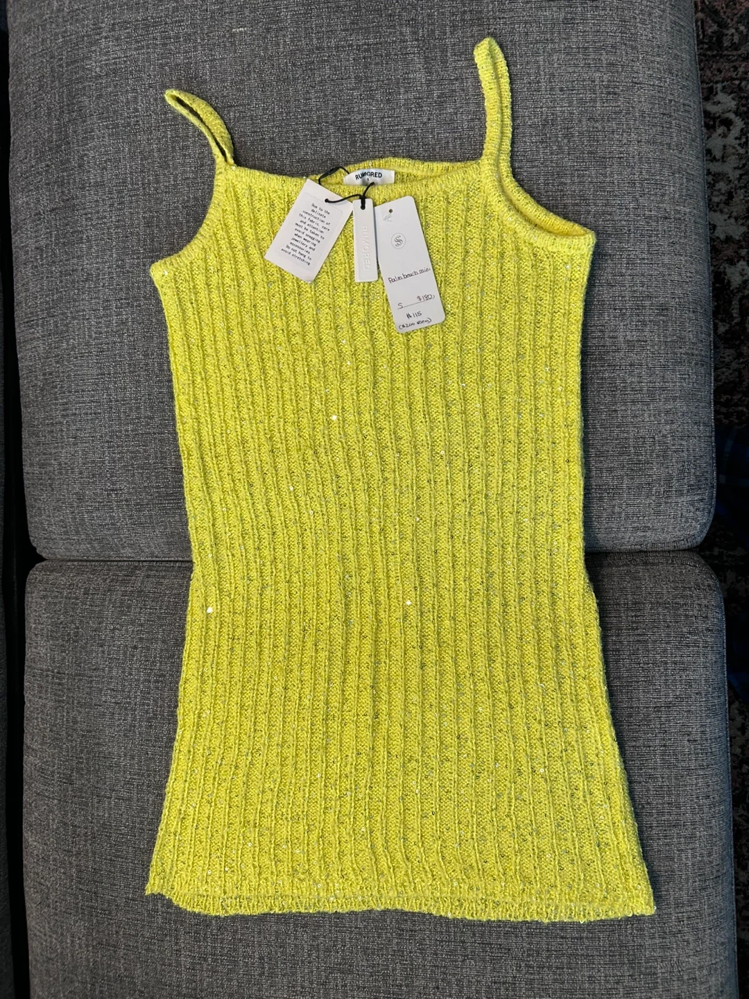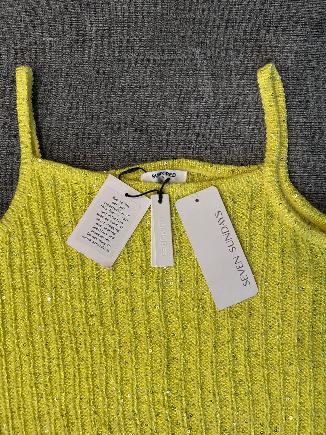 This "Palm Beach Mini" tank top is from Rumored. It features a yellow knit fabric with all-over sequins. Size is S. Original price was $200, I bought it for $115, selling it for $100 firm on my price.
