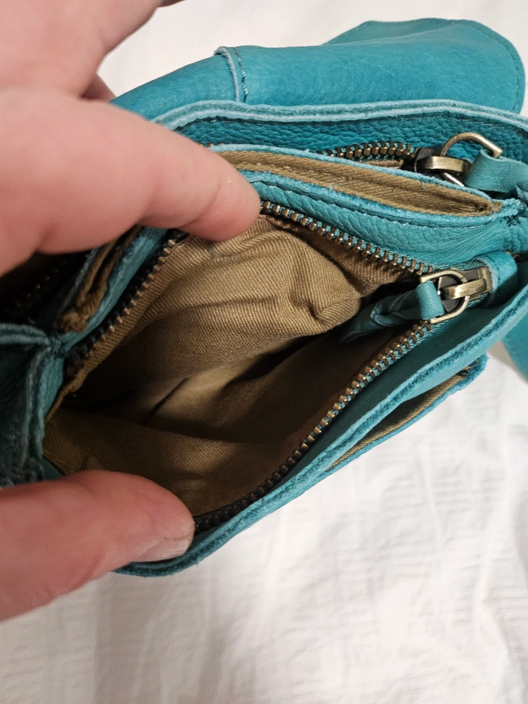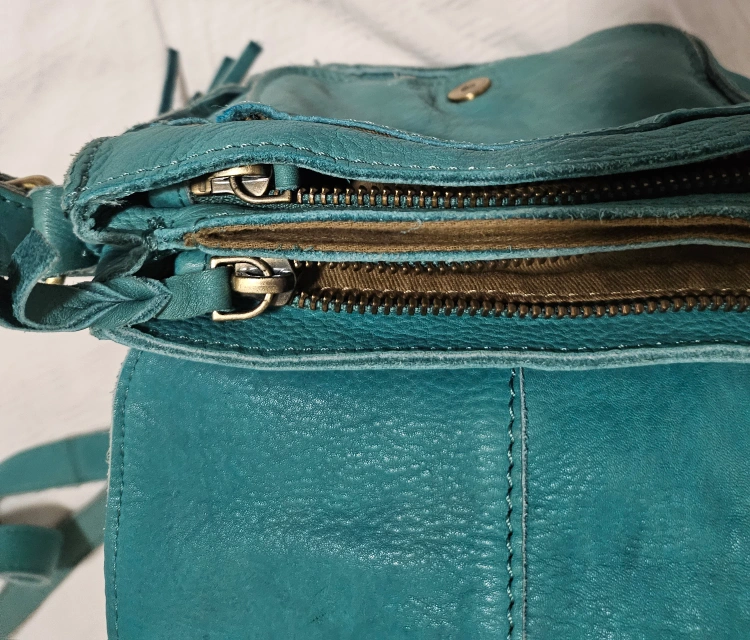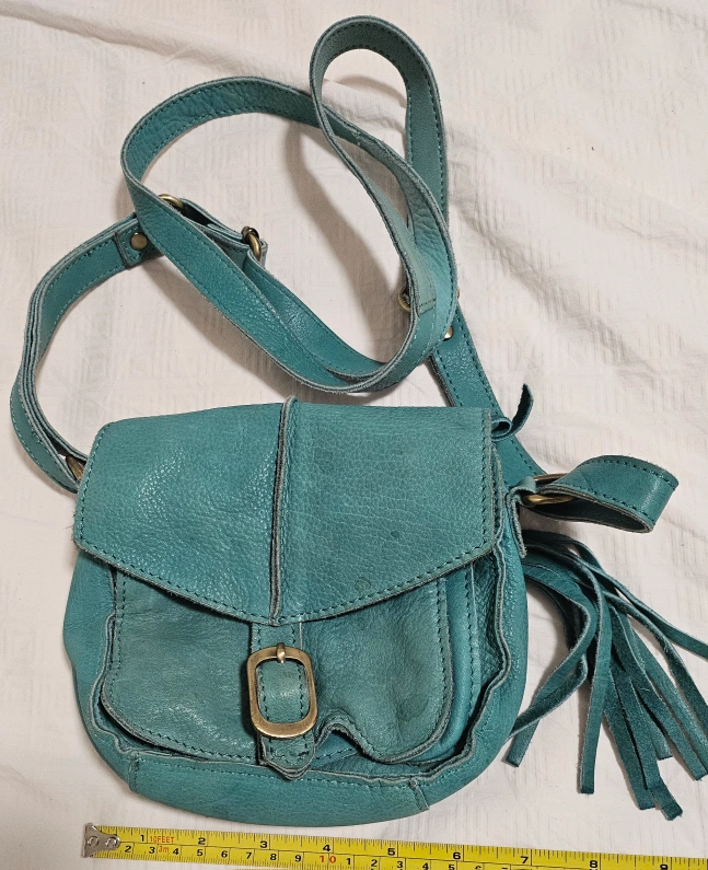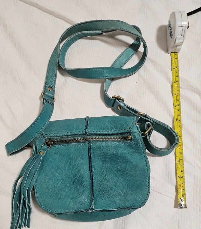 Teal leather crossbody bag with a tassel. Two zippered compartments. Adjustable shoulder strap.