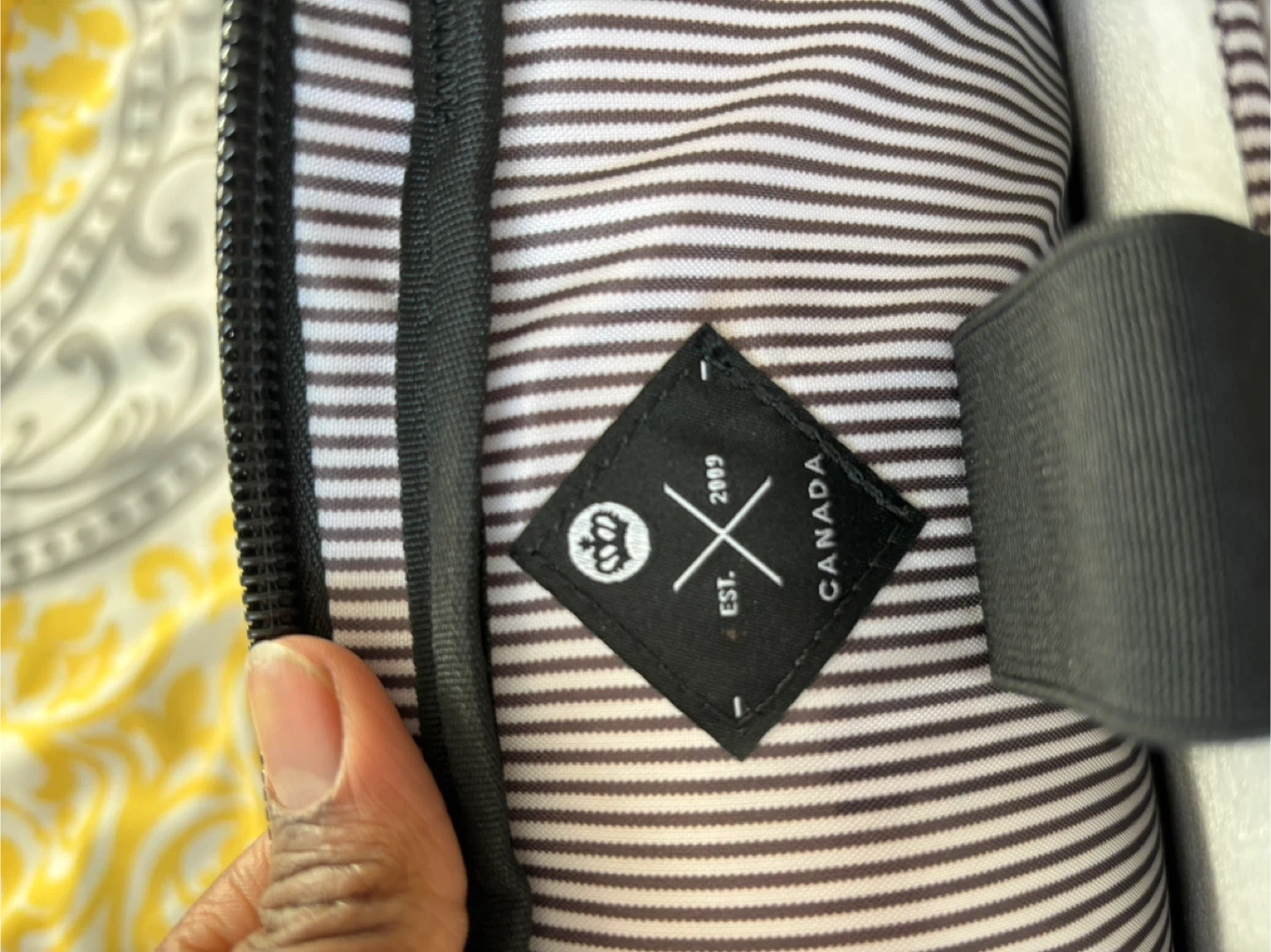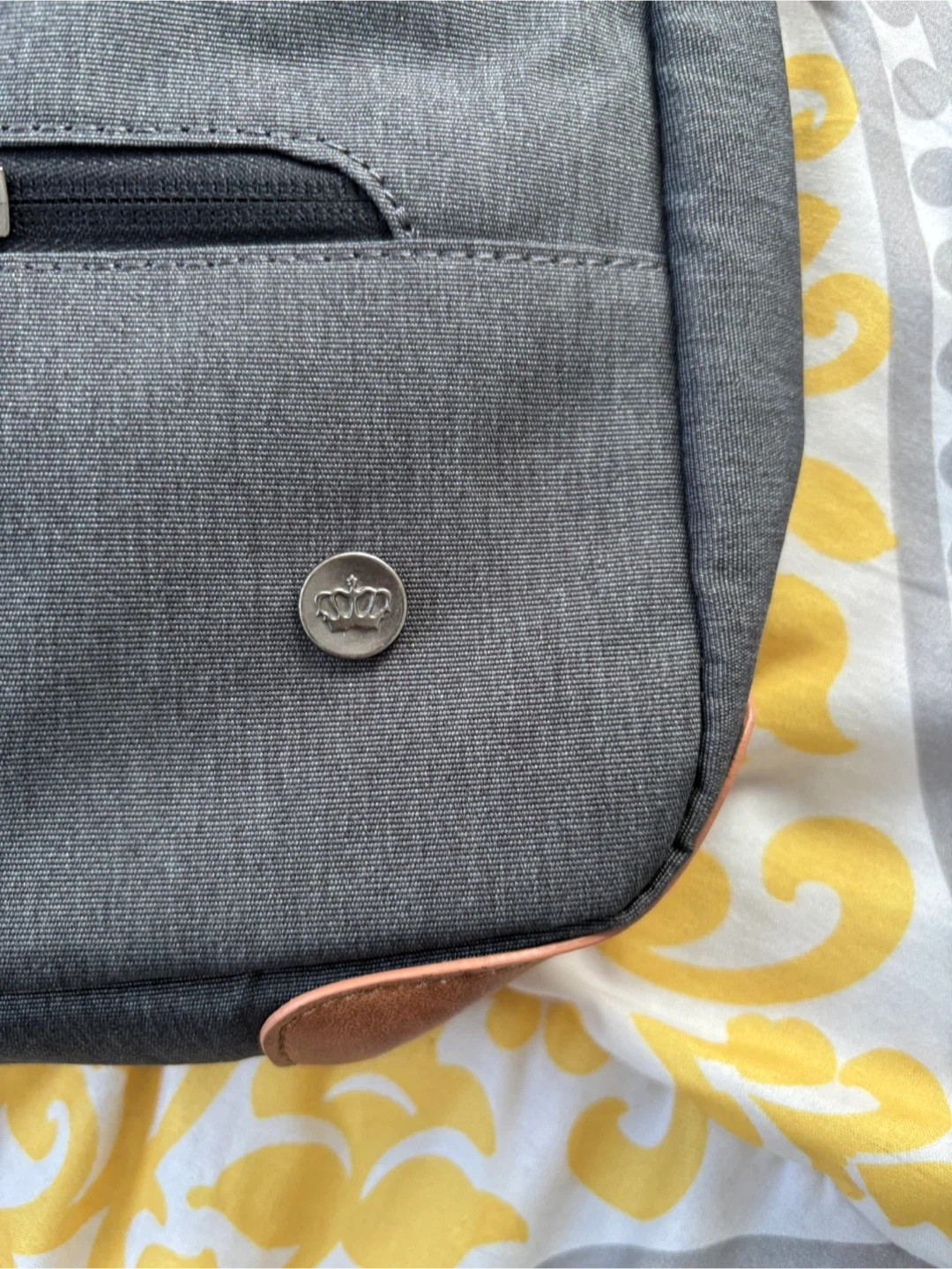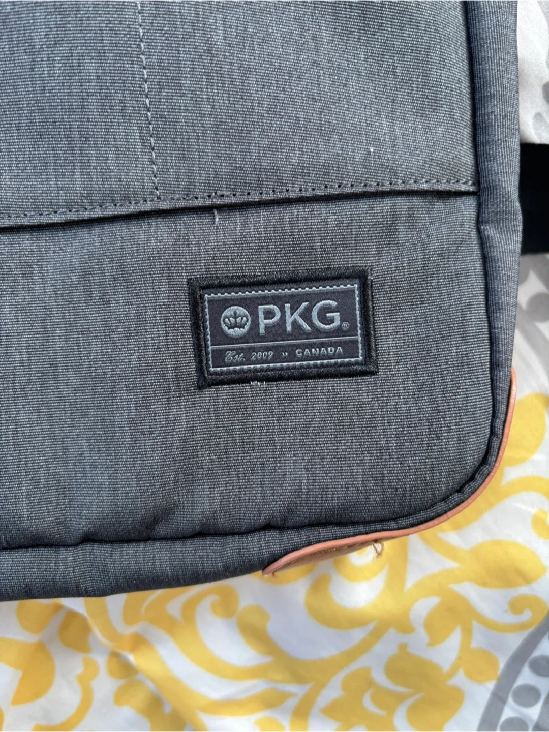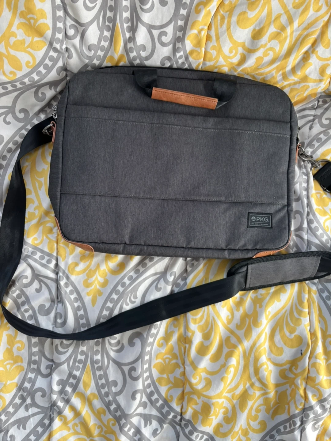 This is a grey PKG brand messenger bag designed for laptops. It's made of durable fabric with a striped interior lining and includes a detachable shoulder strap. Multiple zippered compartments are available for organization.