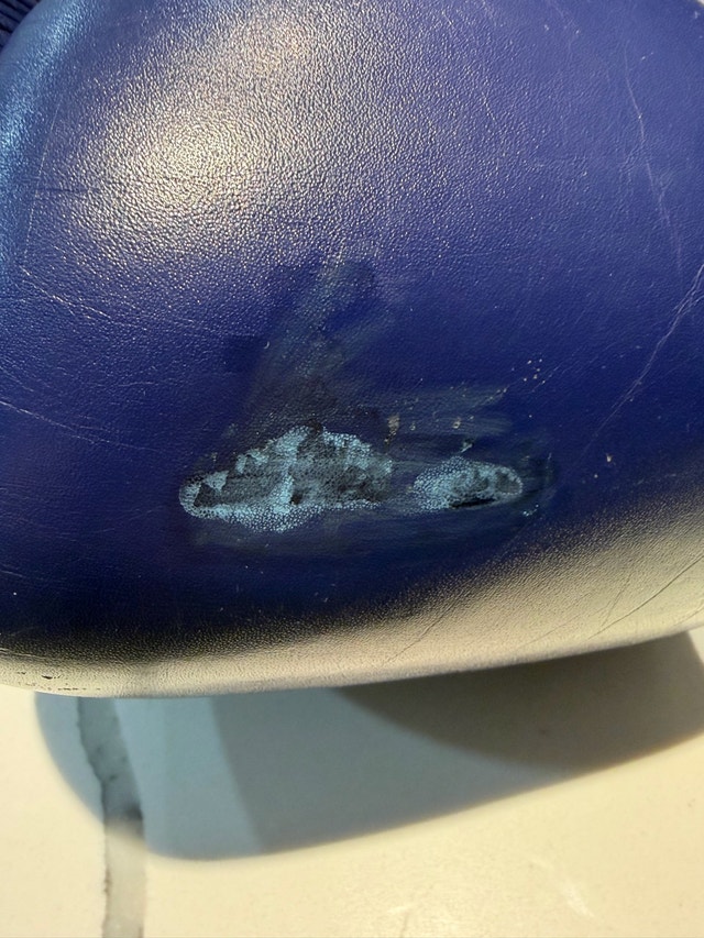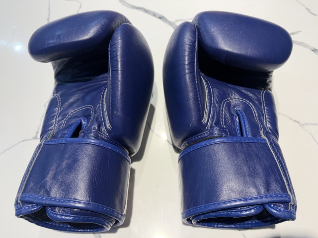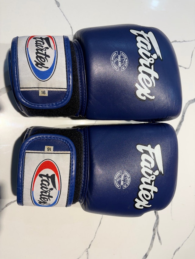 Original Fairtex boxing gloves, 16 oz Hand made in Thailand, genuine leather Used, good overall condition. There is one cosmetic scuff on the leather (see photos), leather is intact – no holes, no tears. Padding is still solid and gloves are fully usable. Perfect for training, sparring, boxing or MMA.