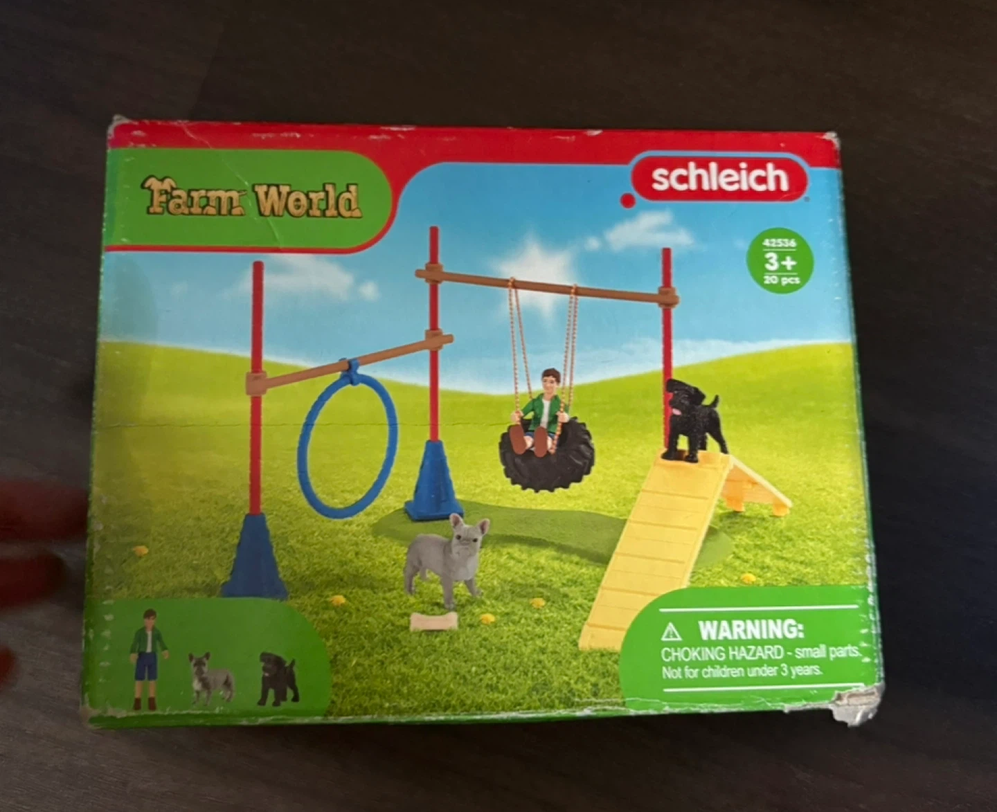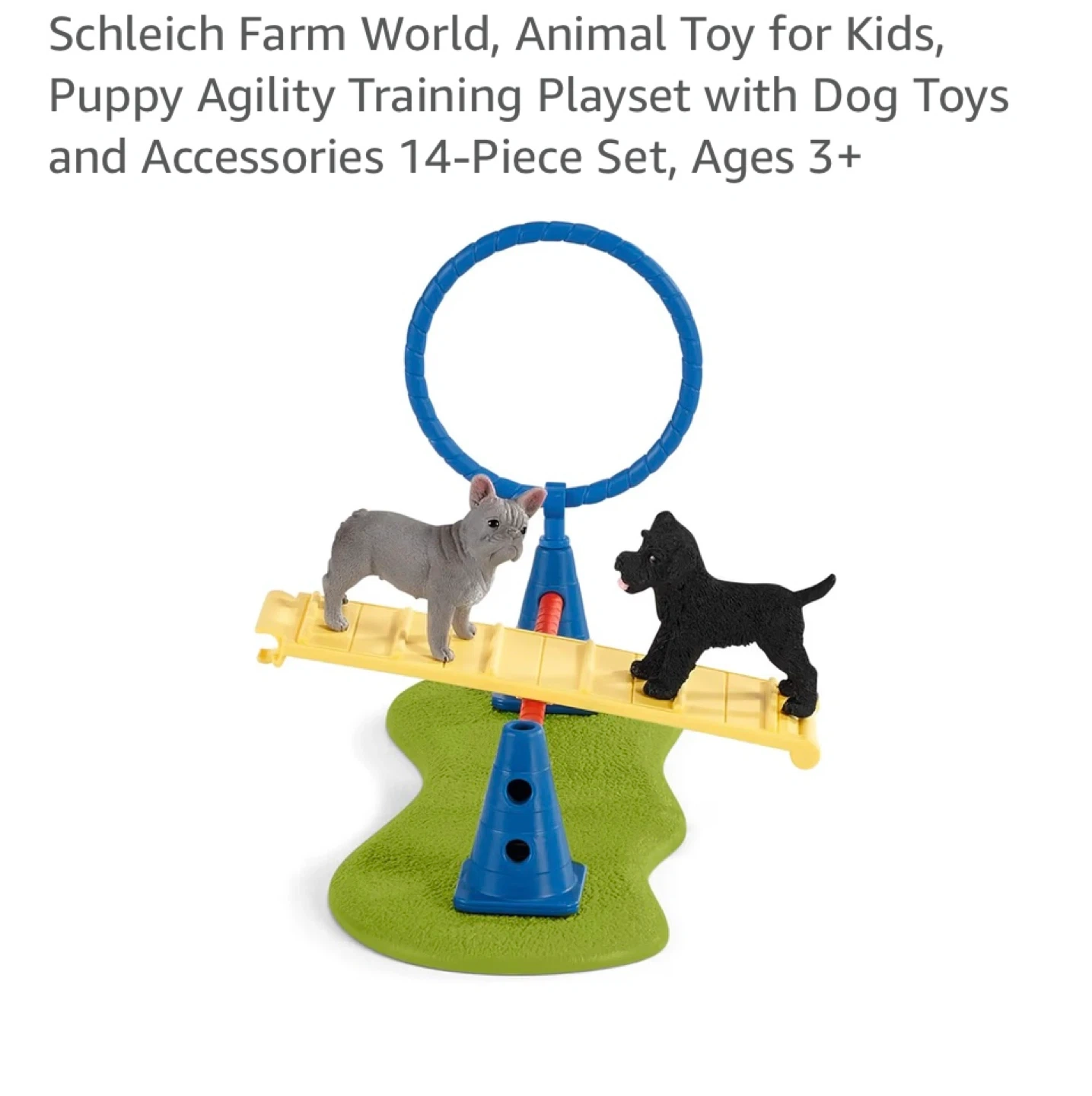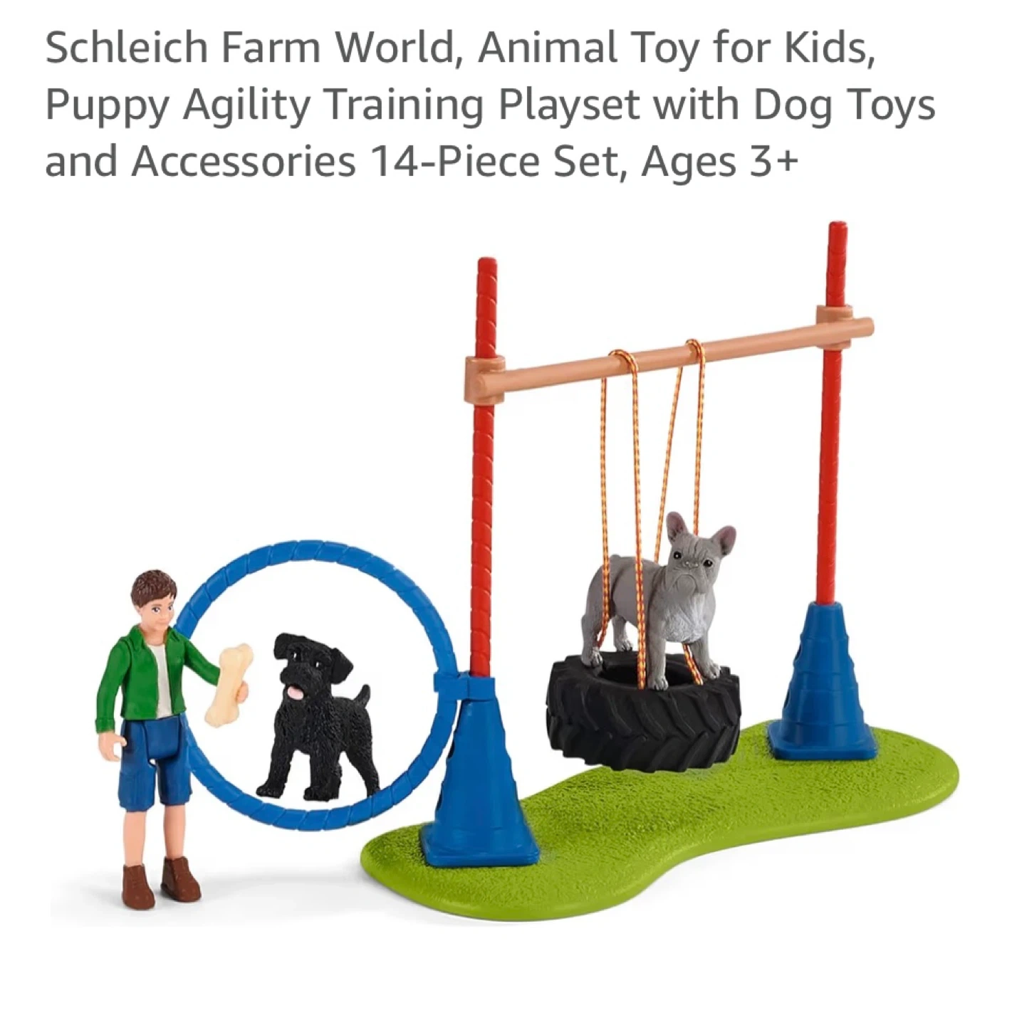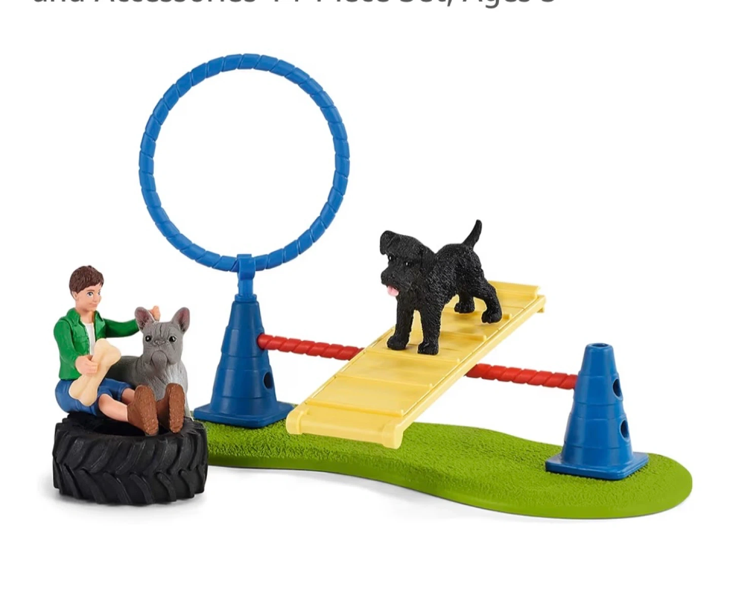 This Schleich Farm World playset includes a figure, two dogs, and an agility course. It's a 14-piece set designed for kids ages 3 and up. Great for imaginative play with your little ones!