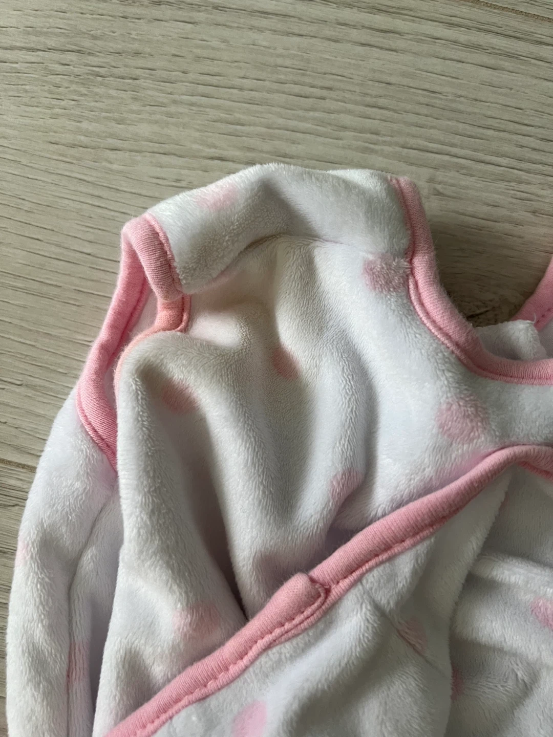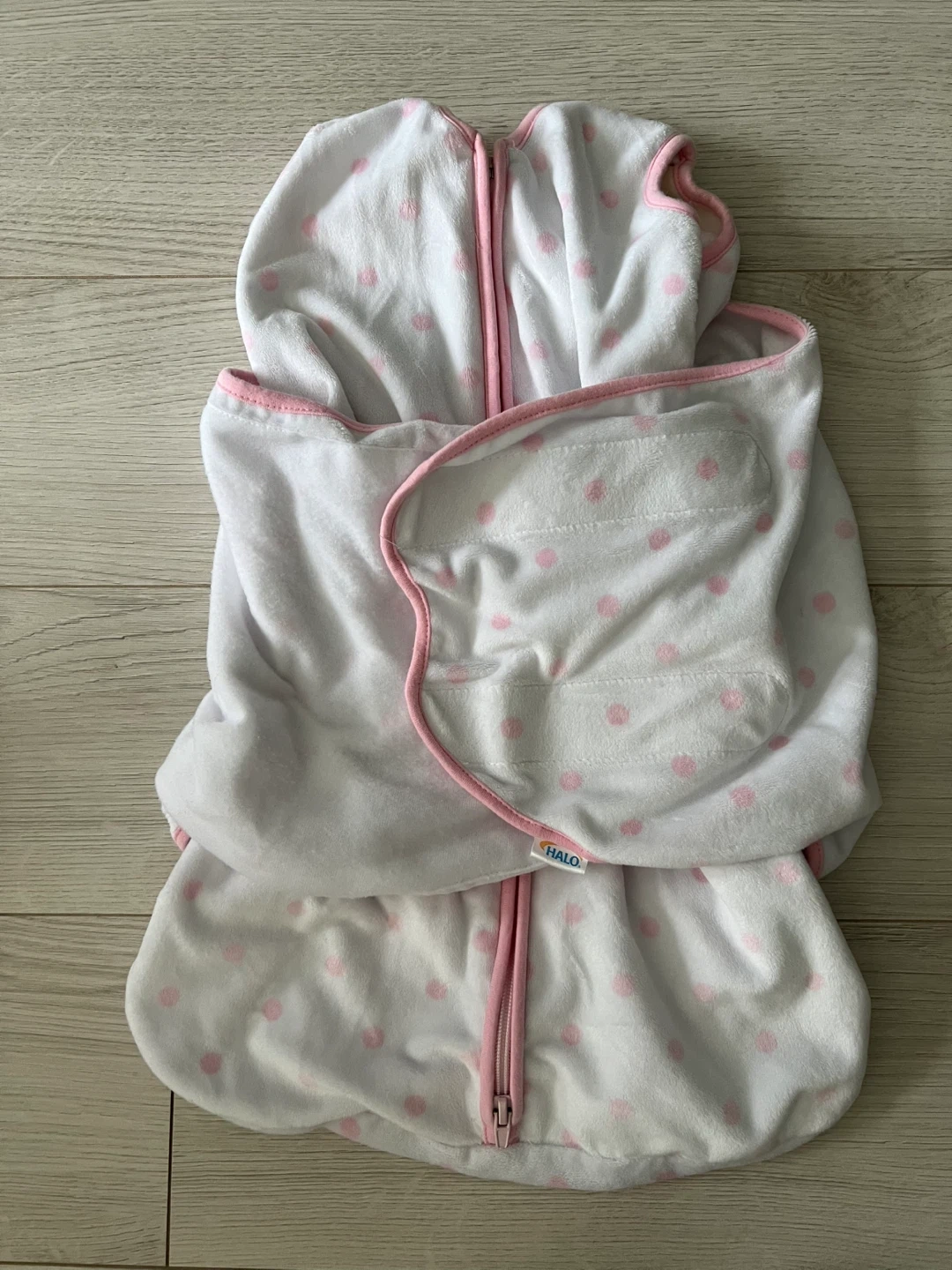 White Halo Sleepsack Swaddle with pink polka dots and trim. Features a zippered closure and velcro wings for secure swaddling. Made of soft, fuzzy material for baby's comfort.
