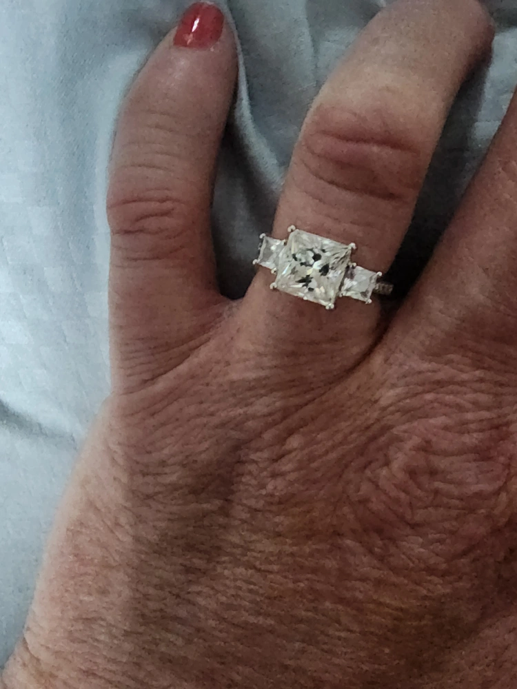 Selling a beautiful princess cut diamond ring. It features a large princess cut center stone, flanked by two smaller stones on either side. The ring is in great condition and ready for a new home!