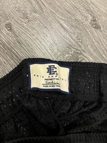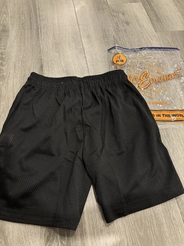 Crafted for comfort and style, these Eric Emanuel EE shorts are a versatile addition to any wardrobe. Featuring a sleek black color, they're designed with a flat front and a drawstring closure for an adjustable fit. The lightweight polyester jersey fabric ensures breathability, making these shorts ideal for casual wear or travel during the warmer seasons of fall, spring, and summer. With a regular fit and a 9-inch inseam, they offer a classic look that's both sporty and sophisticated. The shorts are accented with the Basic Bolt logo, adding a touch of designer flair. They come in a size large, with a waist size of 32 inches, and are accompanied by an authentic Eric Emanuel bag for convenience.
