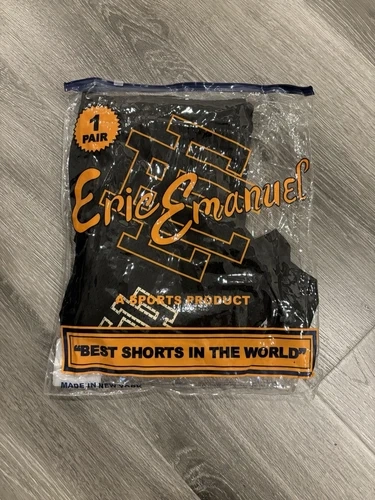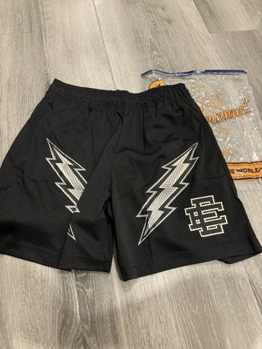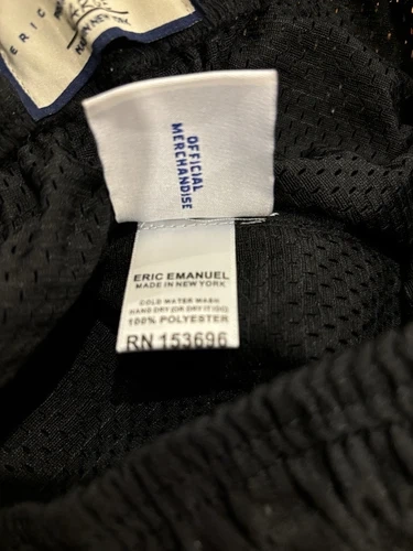 Crafted for comfort and style, these Eric Emanuel EE shorts are a versatile addition to any wardrobe. Featuring a sleek black color, they're designed with a flat front and a drawstring closure for an adjustable fit. The lightweight polyester jersey fabric ensures breathability, making these shorts ideal for casual wear or travel during the warmer seasons of fall, spring, and summer. With a regular fit and a 9-inch inseam, they offer a classic look that's both sporty and sophisticated. The shorts are accented with the Basic Bolt logo, adding a touch of designer flair. They come in a size large, with a waist size of 32 inches, and are accompanied by an authentic Eric Emanuel bag for convenience.