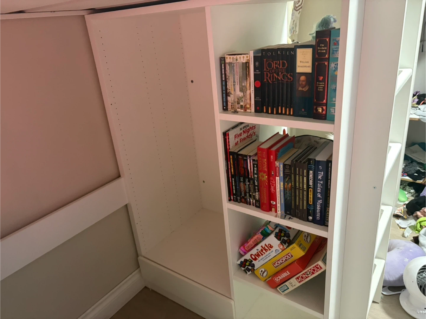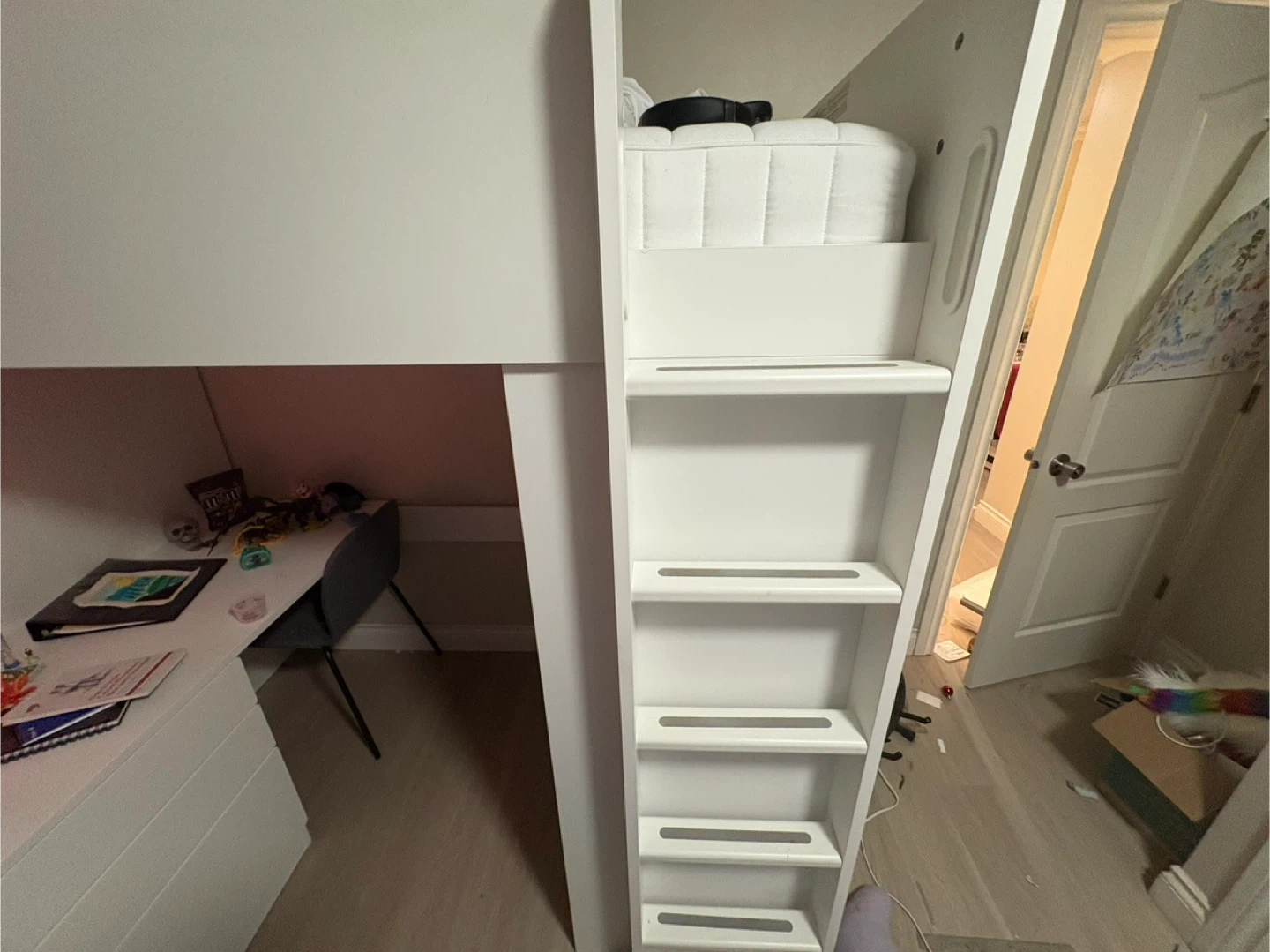 This is an IKEA SMÅSTAD loft bed in white, featuring a desk and four drawers. It includes shelves for storage and a built-in ladder for easy access to the top bunk. It's a great space-saving solution for bedrooms!