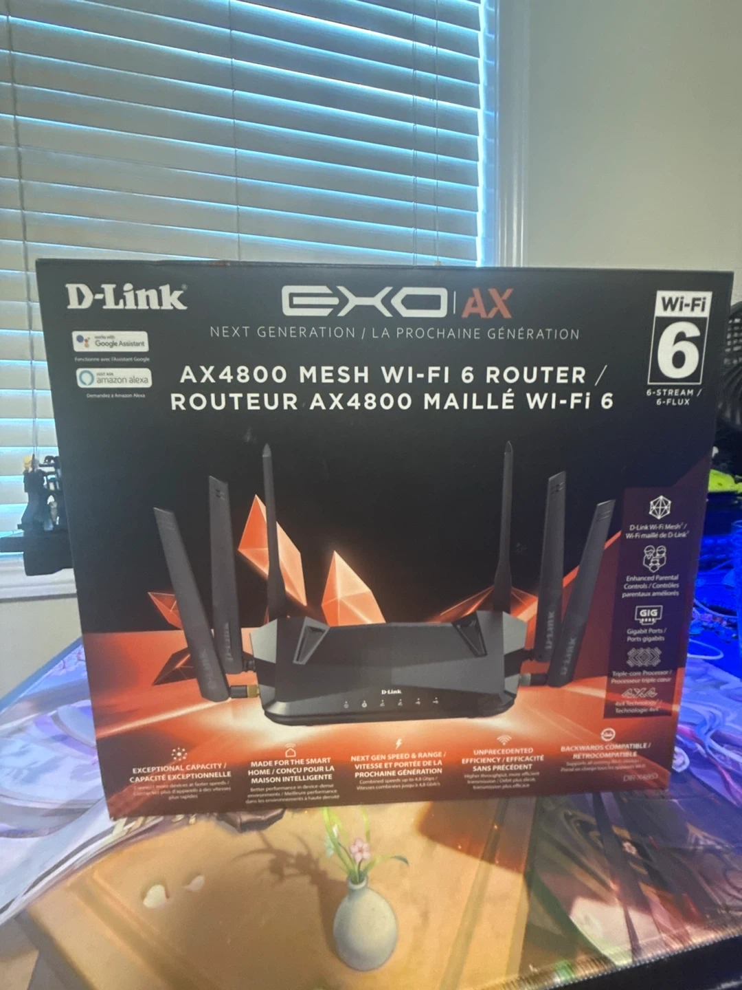 Selling a D-Link EXO AX AX4800 Mesh Wi-Fi 6 Router. It's a next-generation router that works with Google Assistant and Amazon Alexa. It has exceptional capacity and is made for the smart home. It also offers next-gen speed and range, with unprecedented efficiency. It's backwards compatible too