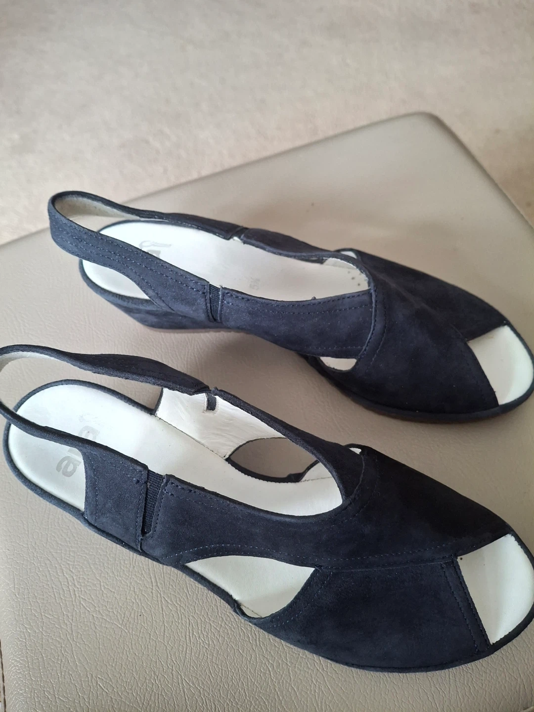 Navy suede sling back shoes with 2.25” wedge heel. Never been worn. Size 8, Eur size 38.5. Ara brand. One slight mark on one shoe as shown in photo.
