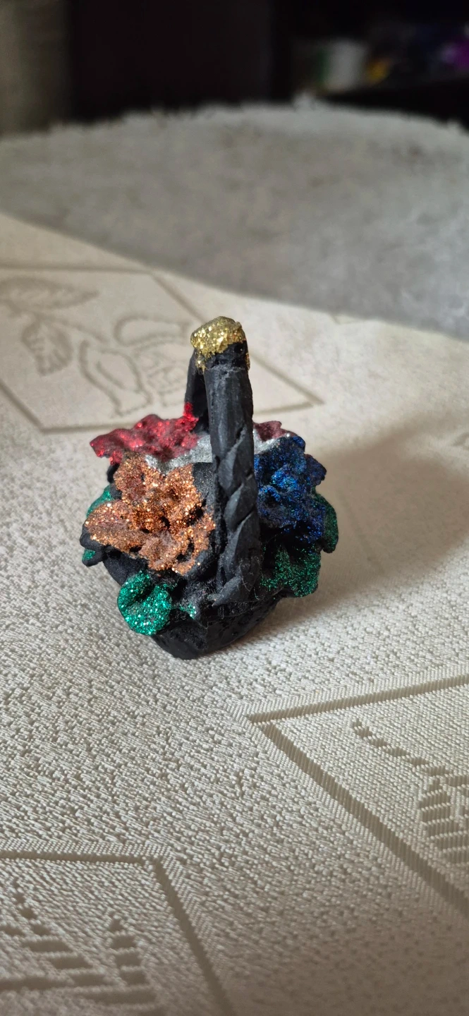 #gifting -Here's a cute mini decorative flower basket, perfect for adding a touch of charm to any room! It features a black woven basket design with colourful glittery flowers. It's in good condition and ready to brighten up your space.