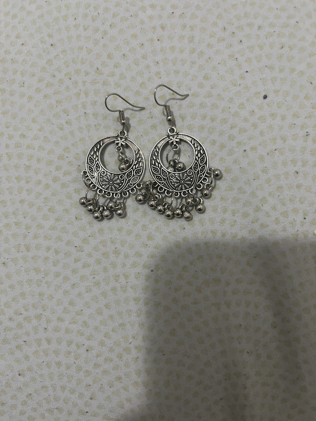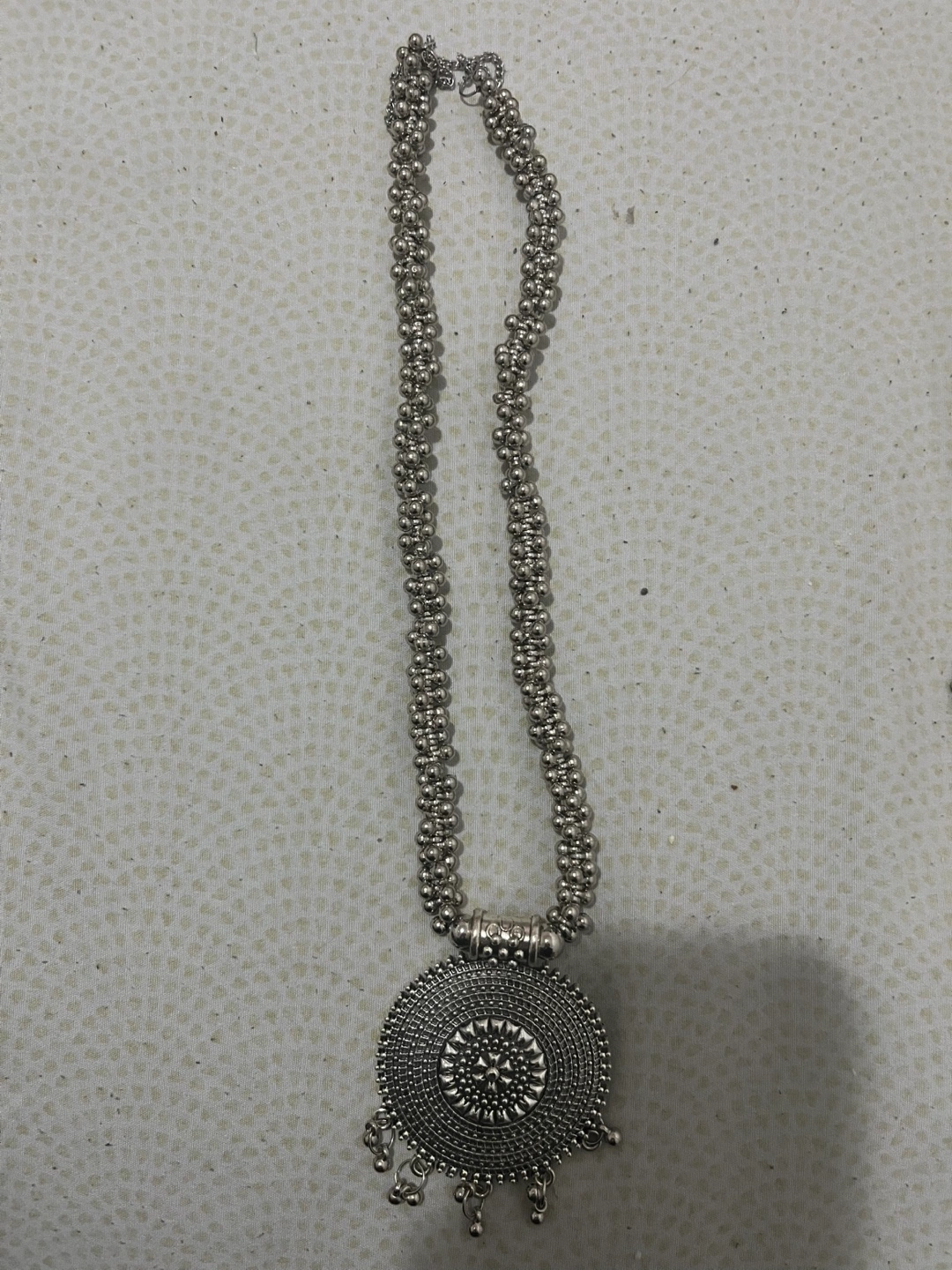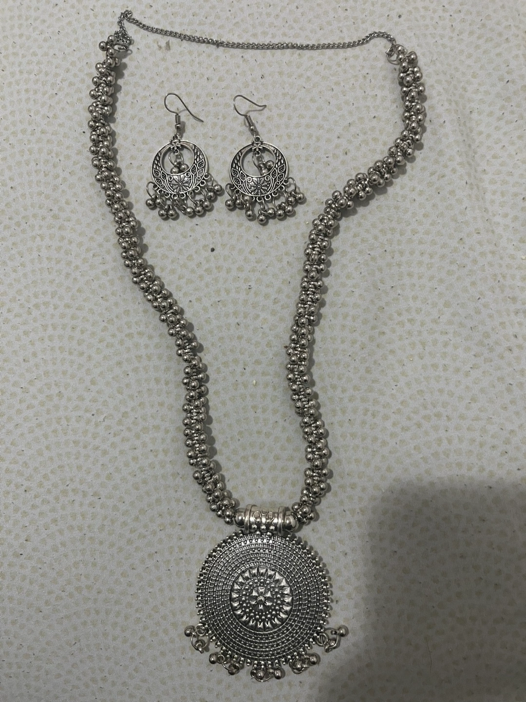 Silver, oxidized style tone necklace and earrings set. Necklace has a round pendant with intricate detailing and a beaded chain. Earrings have a similar design to the pendant. Cute for Desi dawats, weddings, etc.
