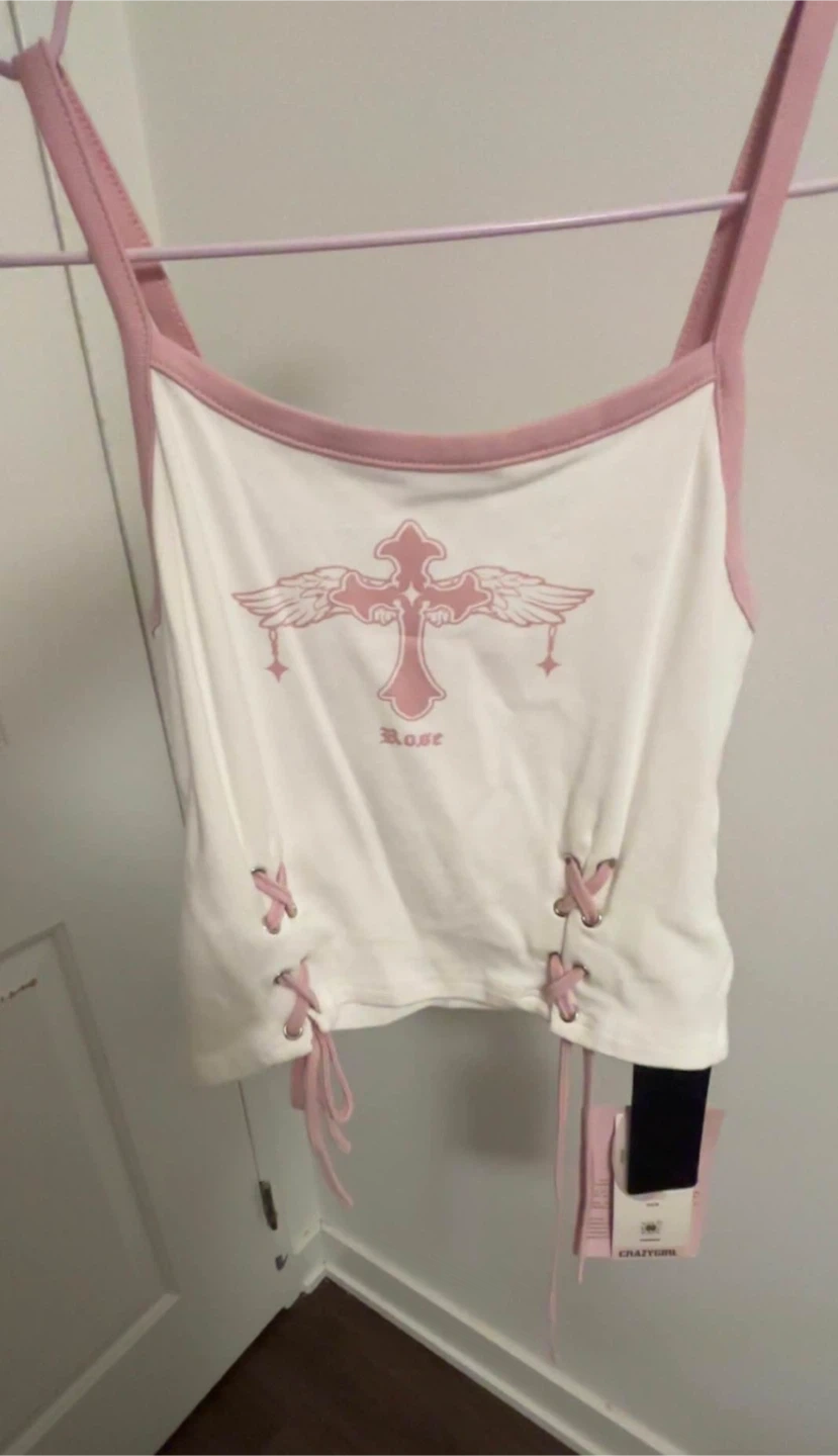 リボンパターンバタフライクロスベルトティアードピンクス Angel Wings Logo Tank Top