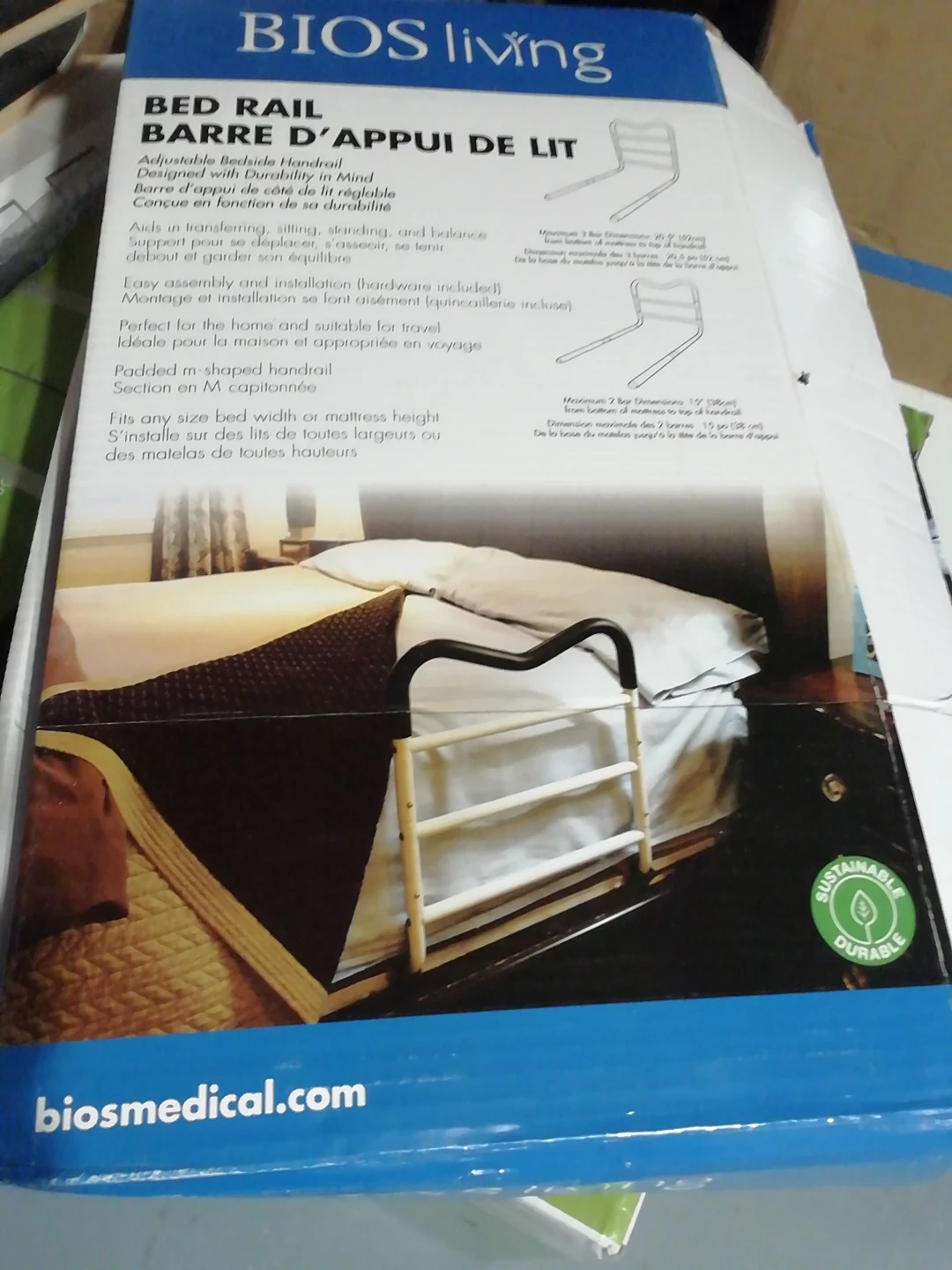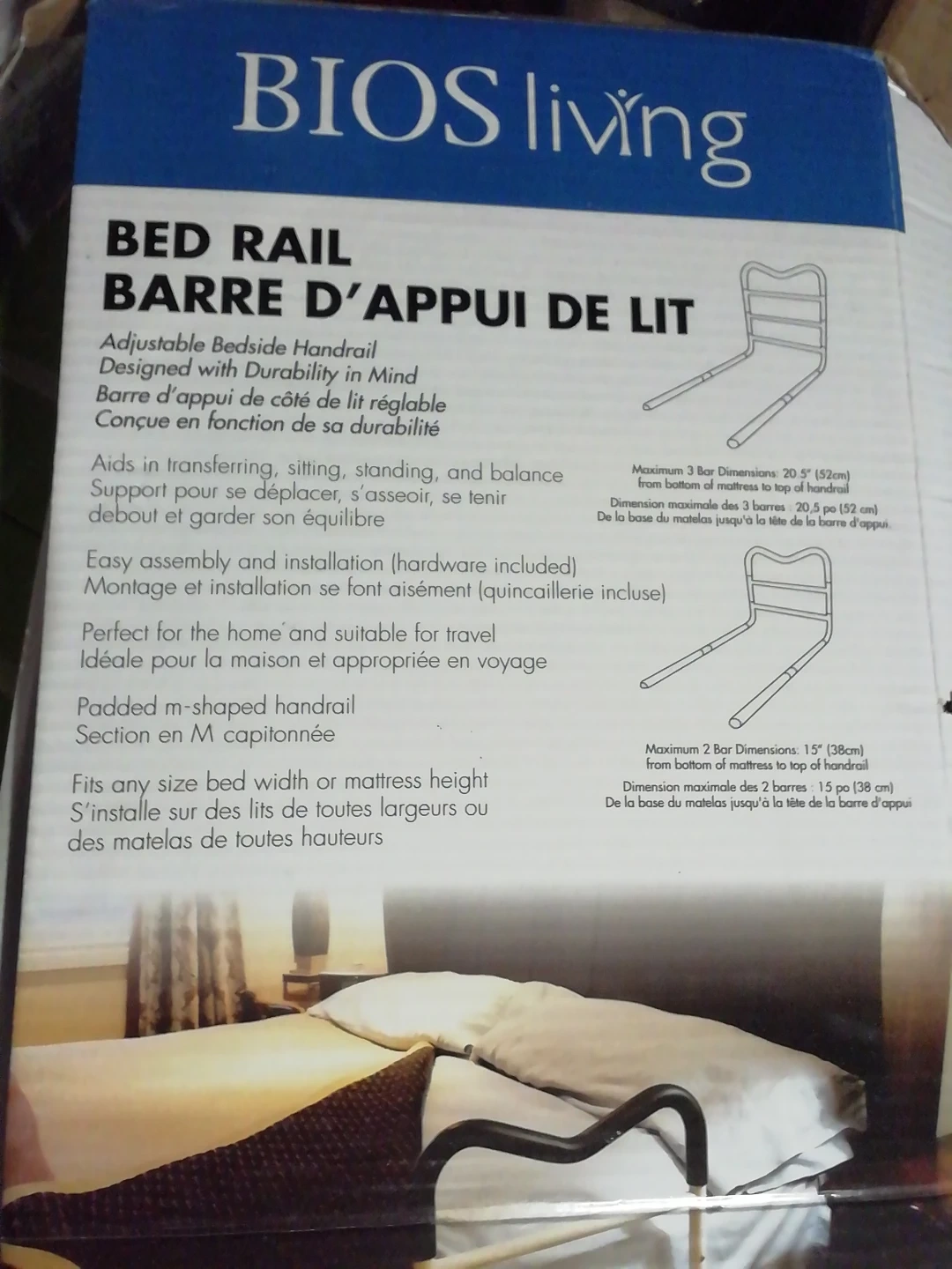 This BIOS living adjustable bedside handrail aids in transferring, sitting, standing, and balance support. It's easy to assemble and fits any bed width or mattress height. The padded m-shaped handrail provides comfort. Perfect for home use and travel!