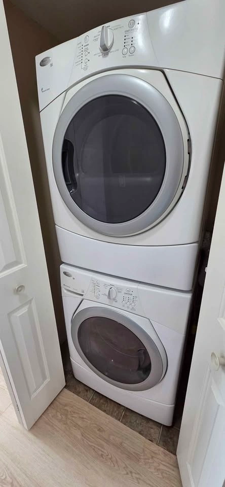 The unfurnished unit includes a spacious kitchen and in-suite laundry machines.