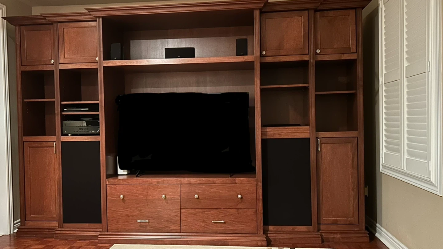 Spacious solid wood entertainment unit in a rich cherry finish. It features multiple shelves, drawers, and cabinet spaces for media storage. The unit includes compartments for electronics.
