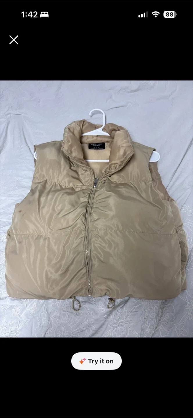This tan puffer vest from Streetwear Society is a great layering piece. It's a size medium with a zip-up front and adjustable drawstring hem. Perfect for adding warmth without the bulk! Pick up cash only