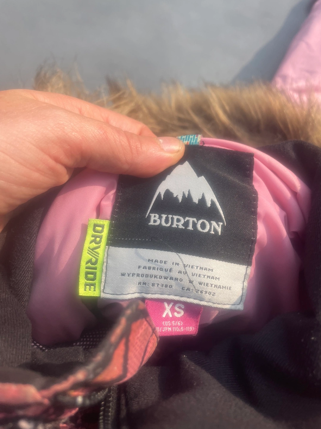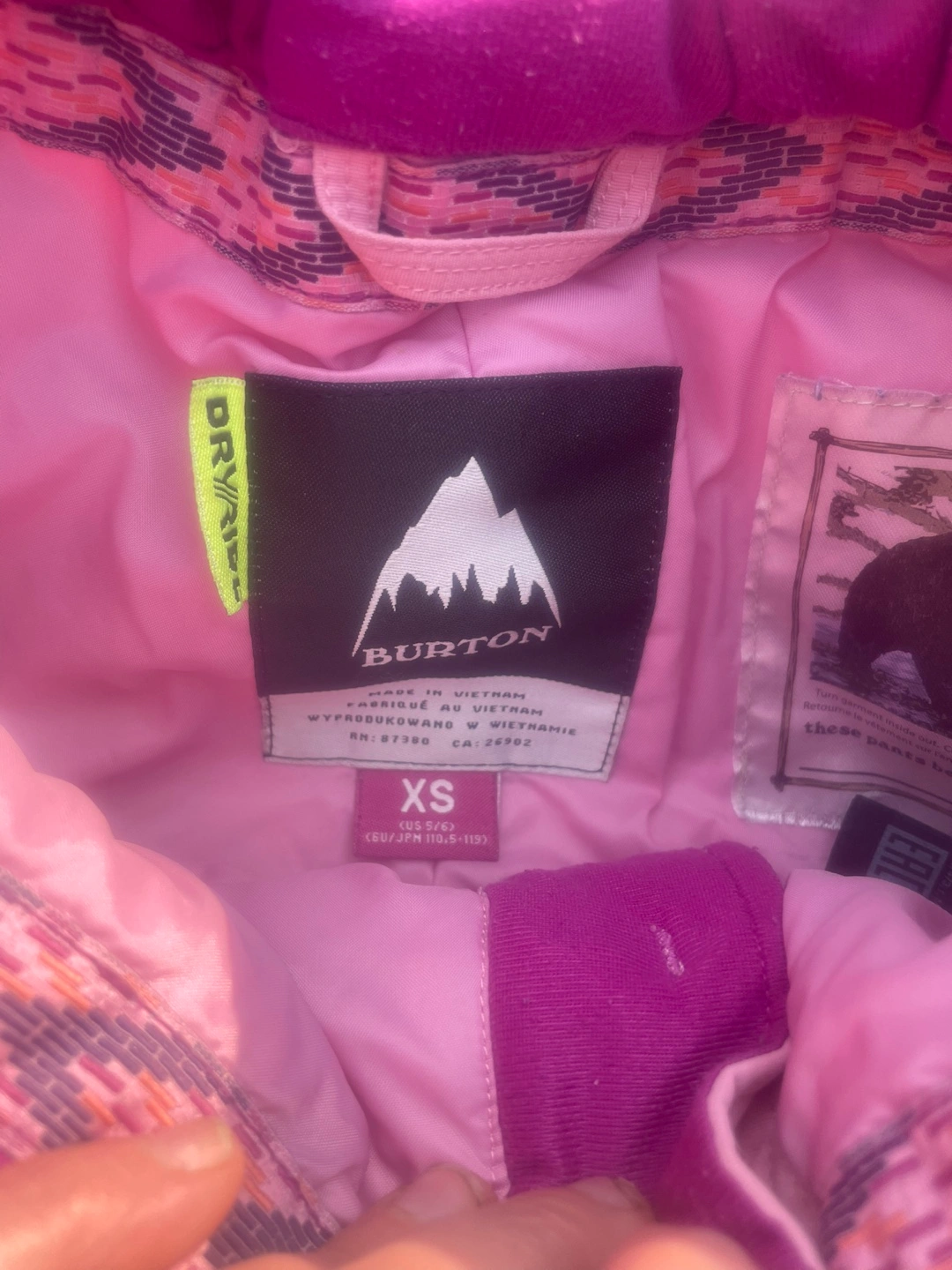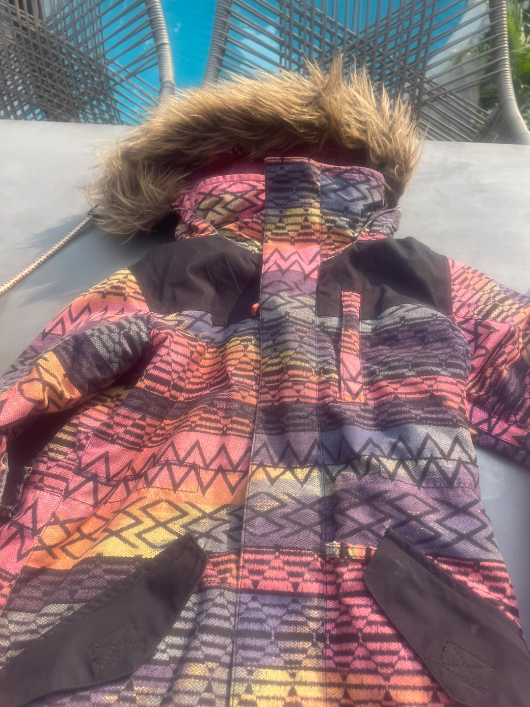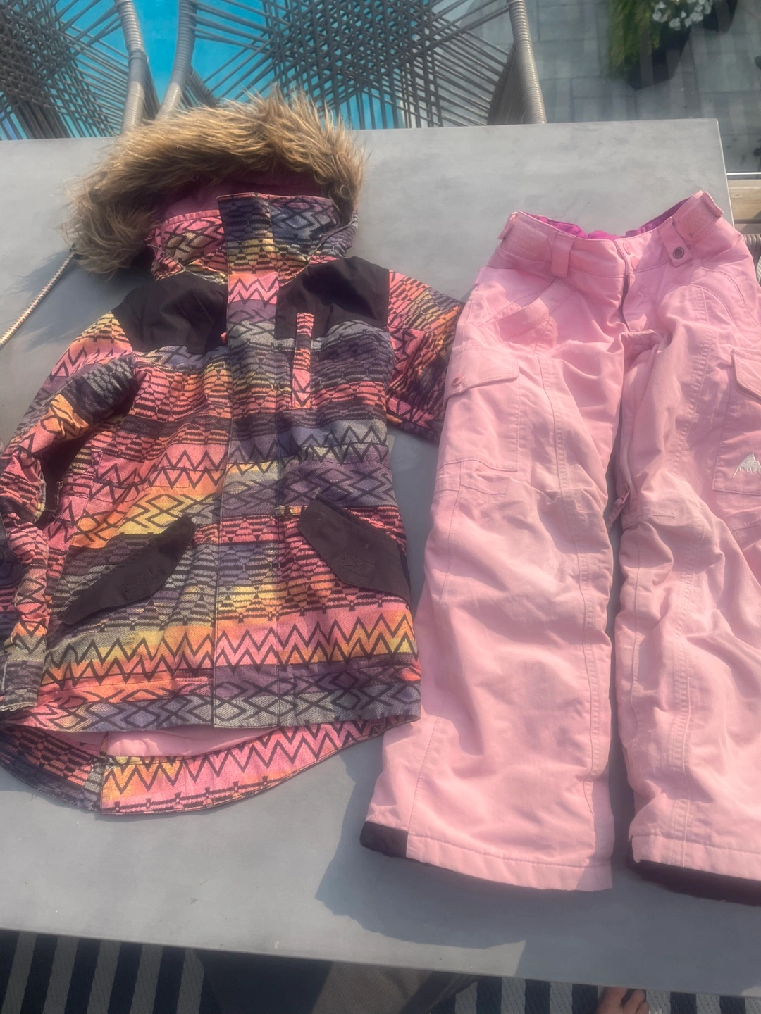 Selling a Burton snowsuit set in size XS (5/6)! The jacket has a fun, colourful pattern and a faux fur hood. The pants are a solid pink color. Great for keeping your little one warm and stylish on the slopes!