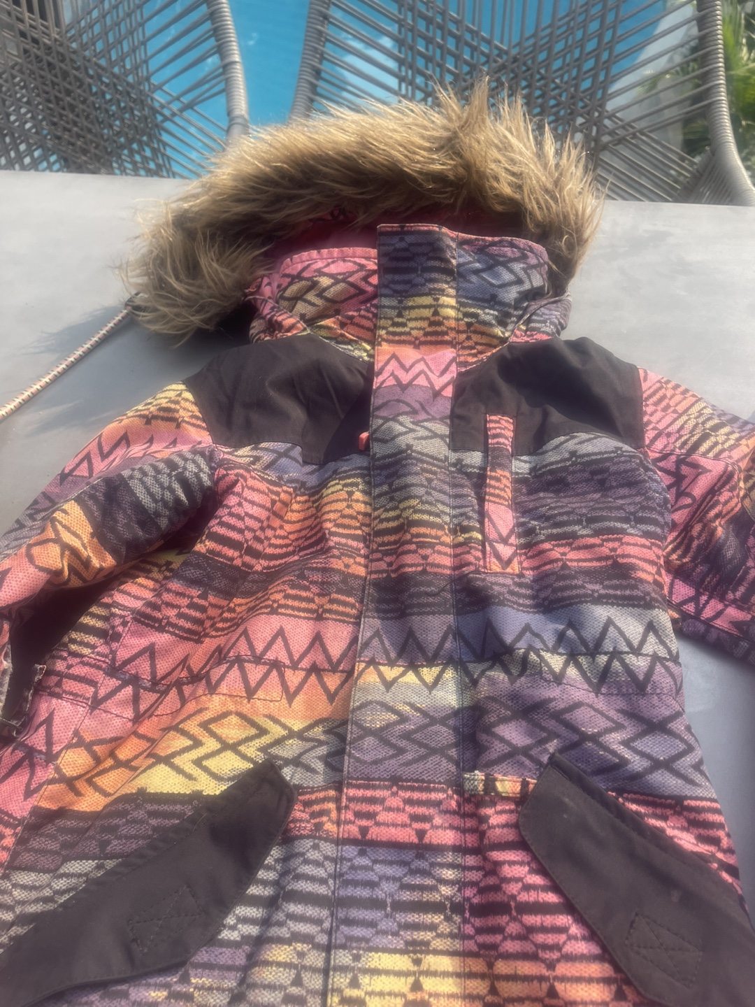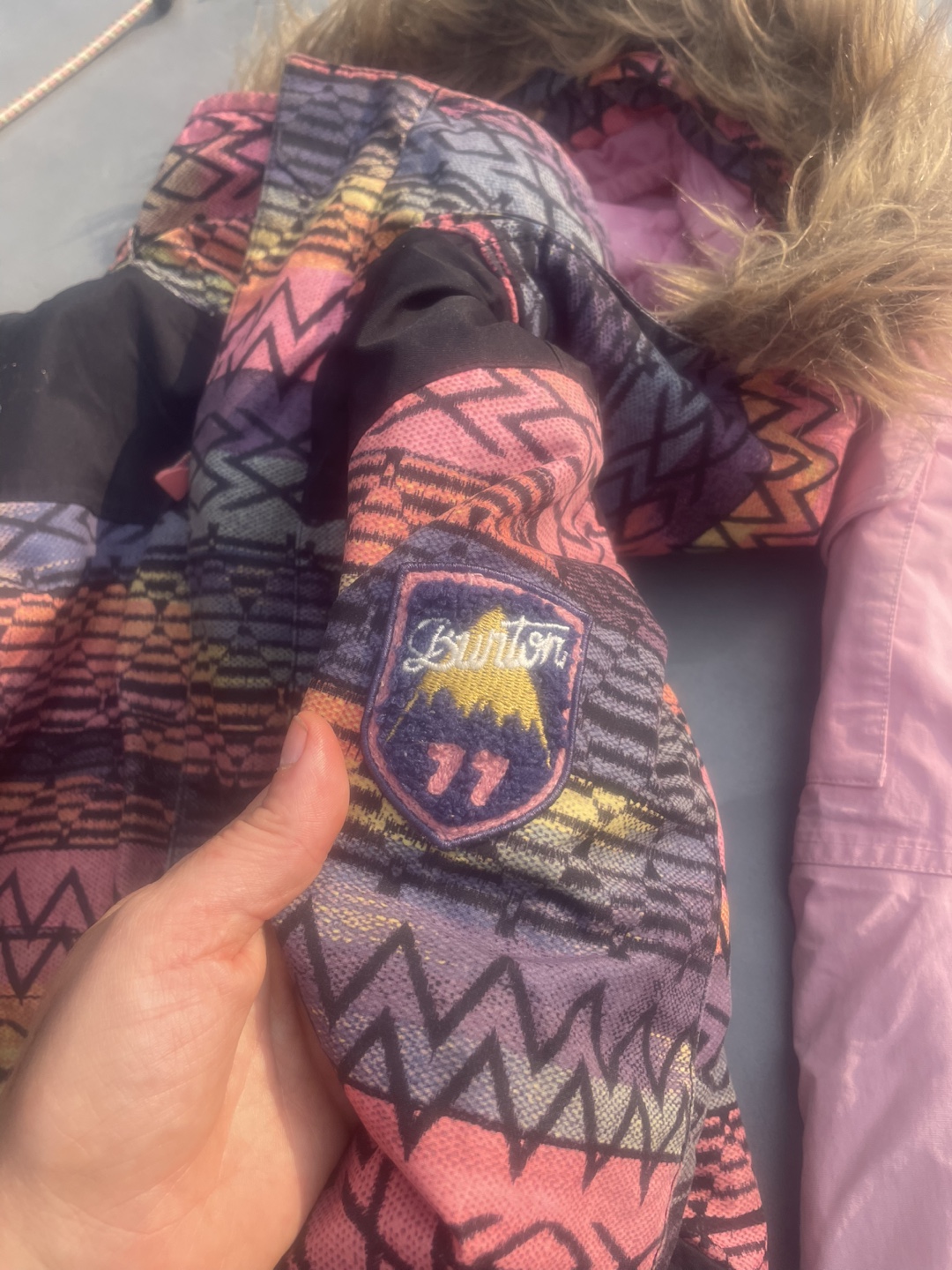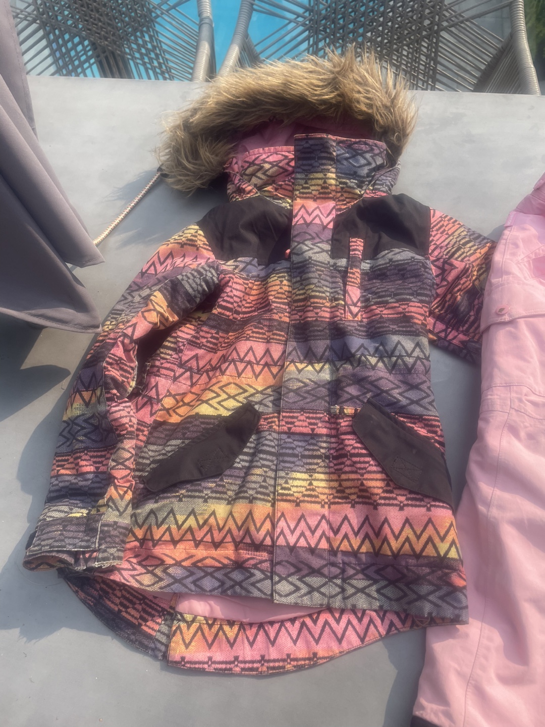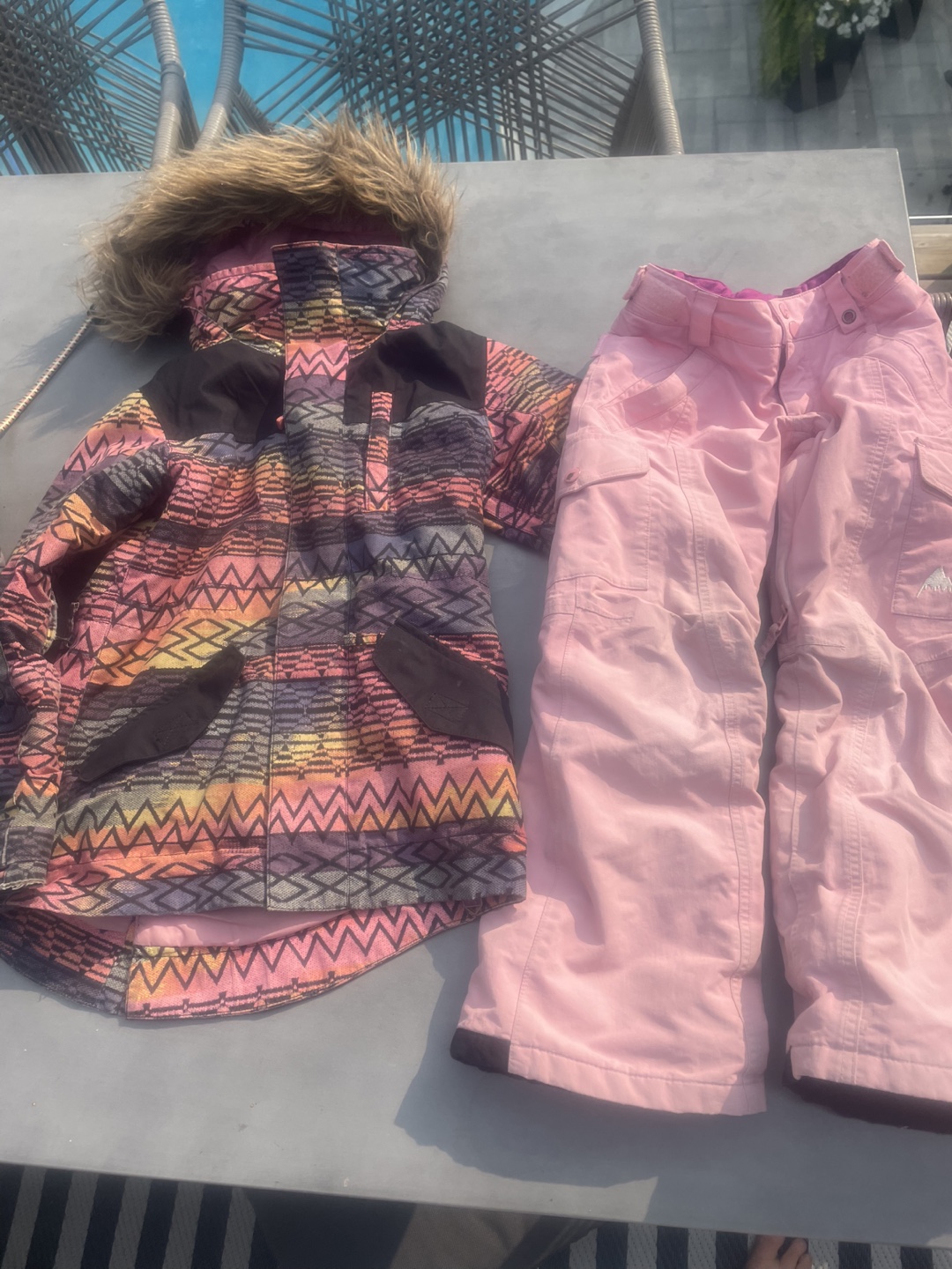 Selling a Burton snowsuit set in size XS (5/6)! The jacket has a fun, colourful pattern and a faux fur hood. The pants are a solid pink color. Great for keeping your little one warm and stylish on the slopes!