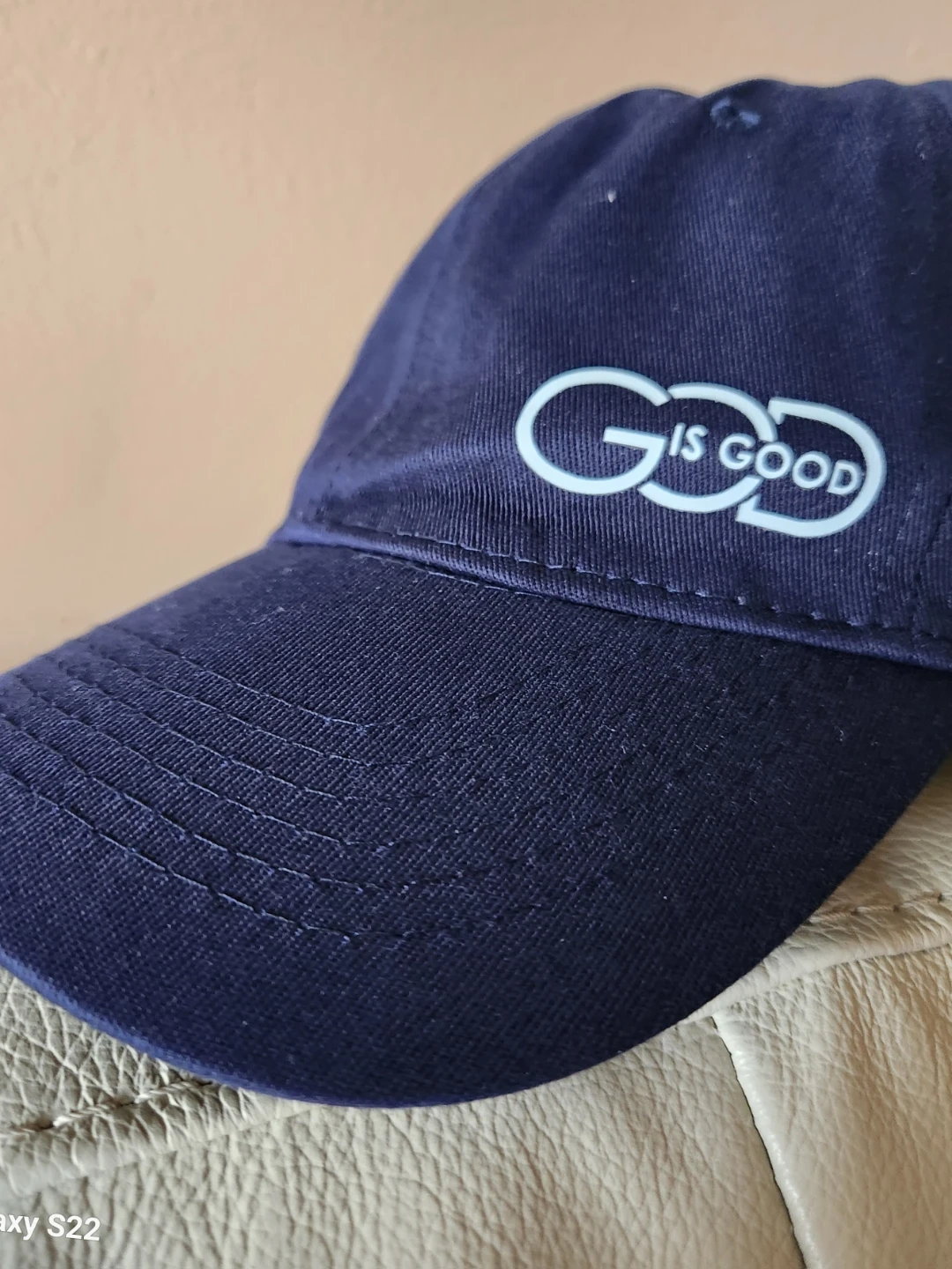 A navy blue baseball cap featuring the phrase 'God Is Good' embroidered on the front. This hat is made of cotton and has a classic curved brim. It's a comfortable accessory for everyday wear.