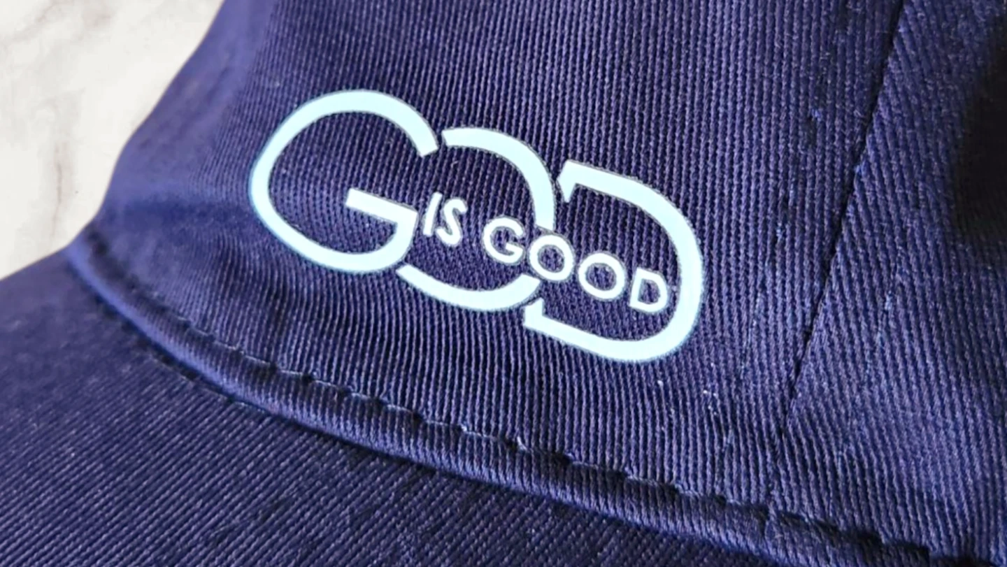 A navy blue baseball cap featuring the phrase 'God Is Good' embroidered on the front. This hat is made of cotton and has a classic curved brim. It's a comfortable accessory for everyday wear.
