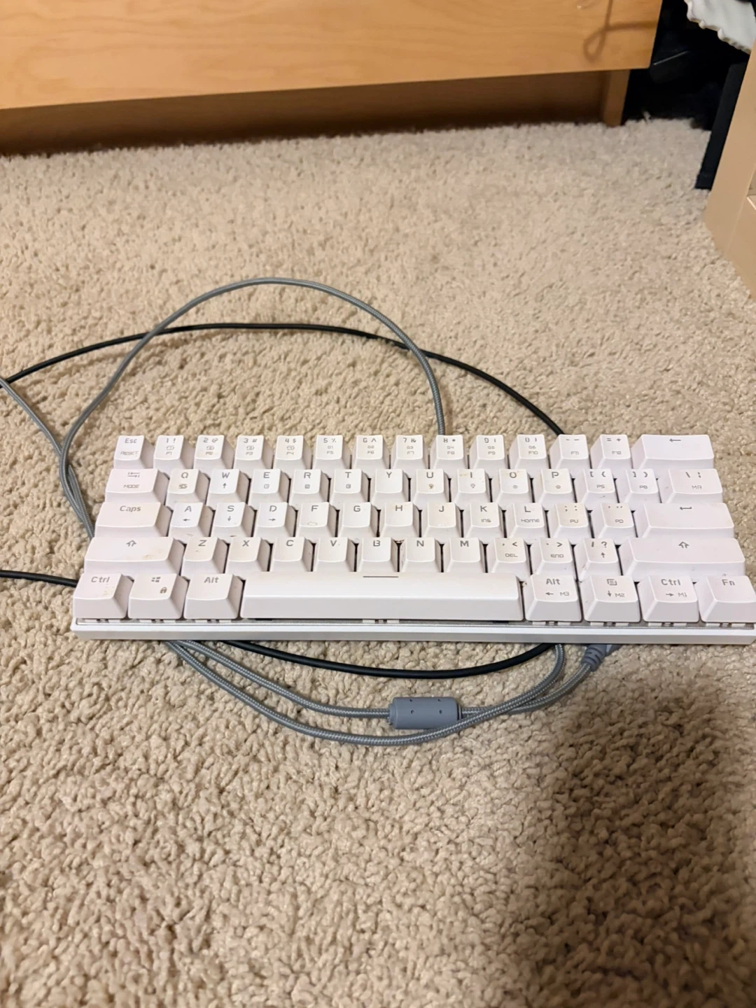 This is a compact white mechanical keyboard. It's a wired keyboard with a white base and white keycaps. The layout is a 60% or similar compact size.
