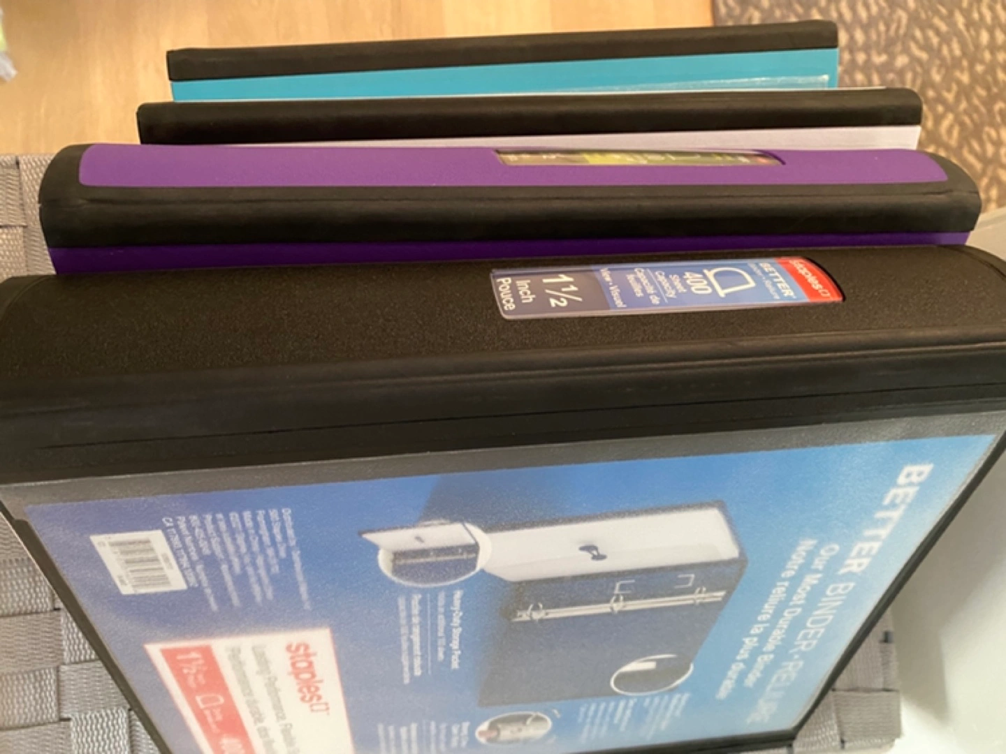Set of 4 Staples Better Binders, 1.5 inch, 400 sheet capacity. Black, blue, purple, and white. Bought for my children and the never used them. Hopefully someone else can else can. #freecycle.