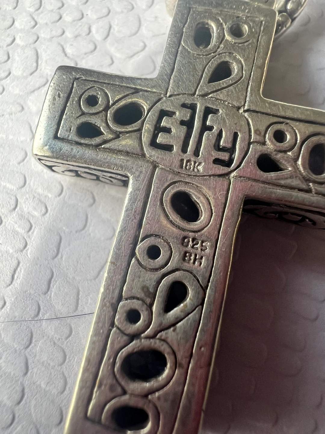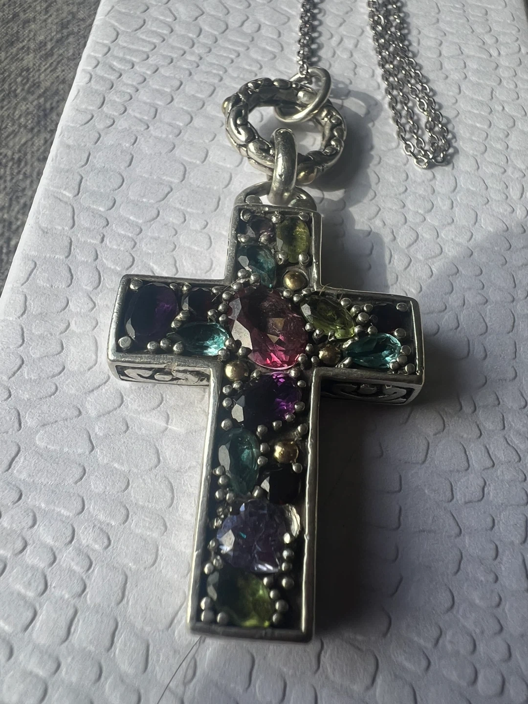 Sterling silver 925 and 18 k yellow gold cross pendant necklace with colourful gemstones. Features "Effy" branding and "925" stamp. A statement piece for any jewelry collection!