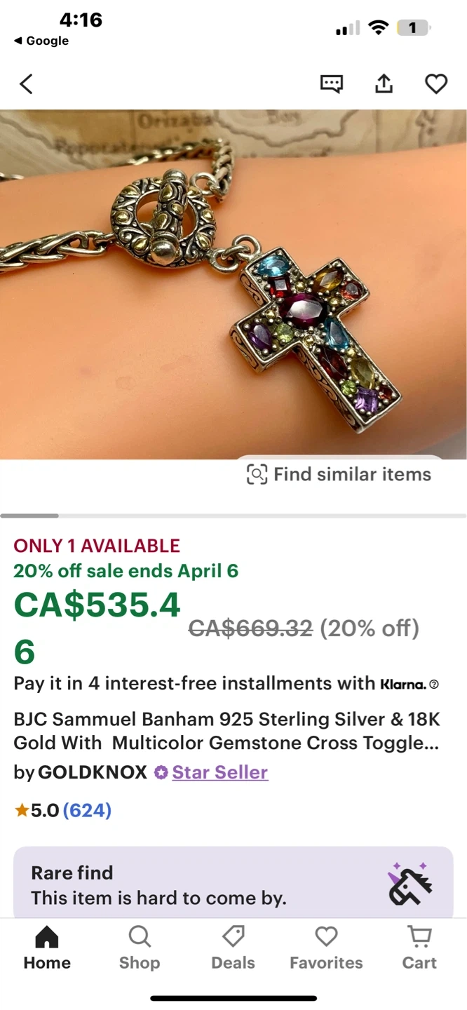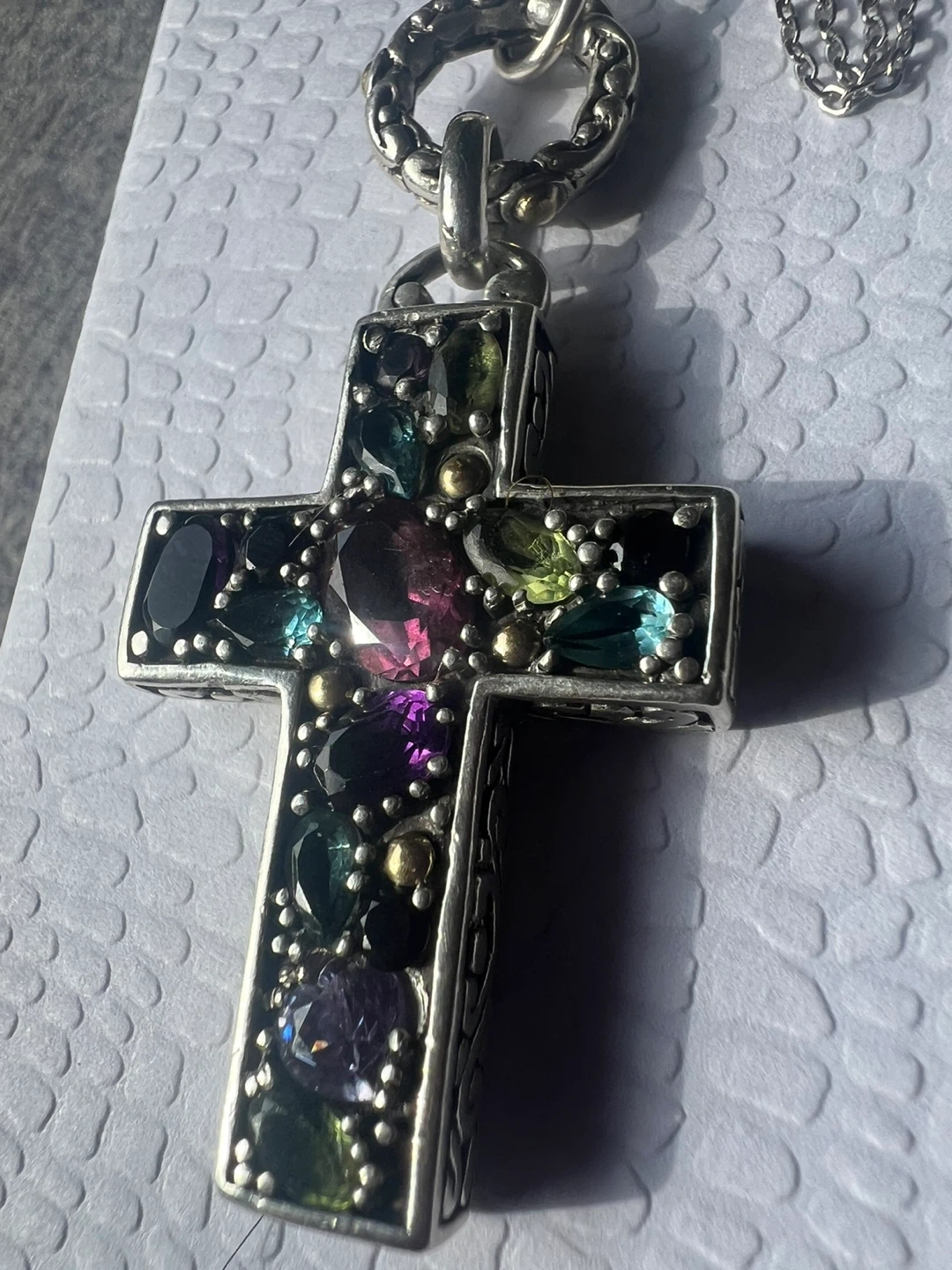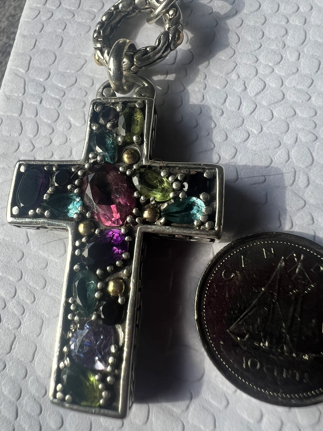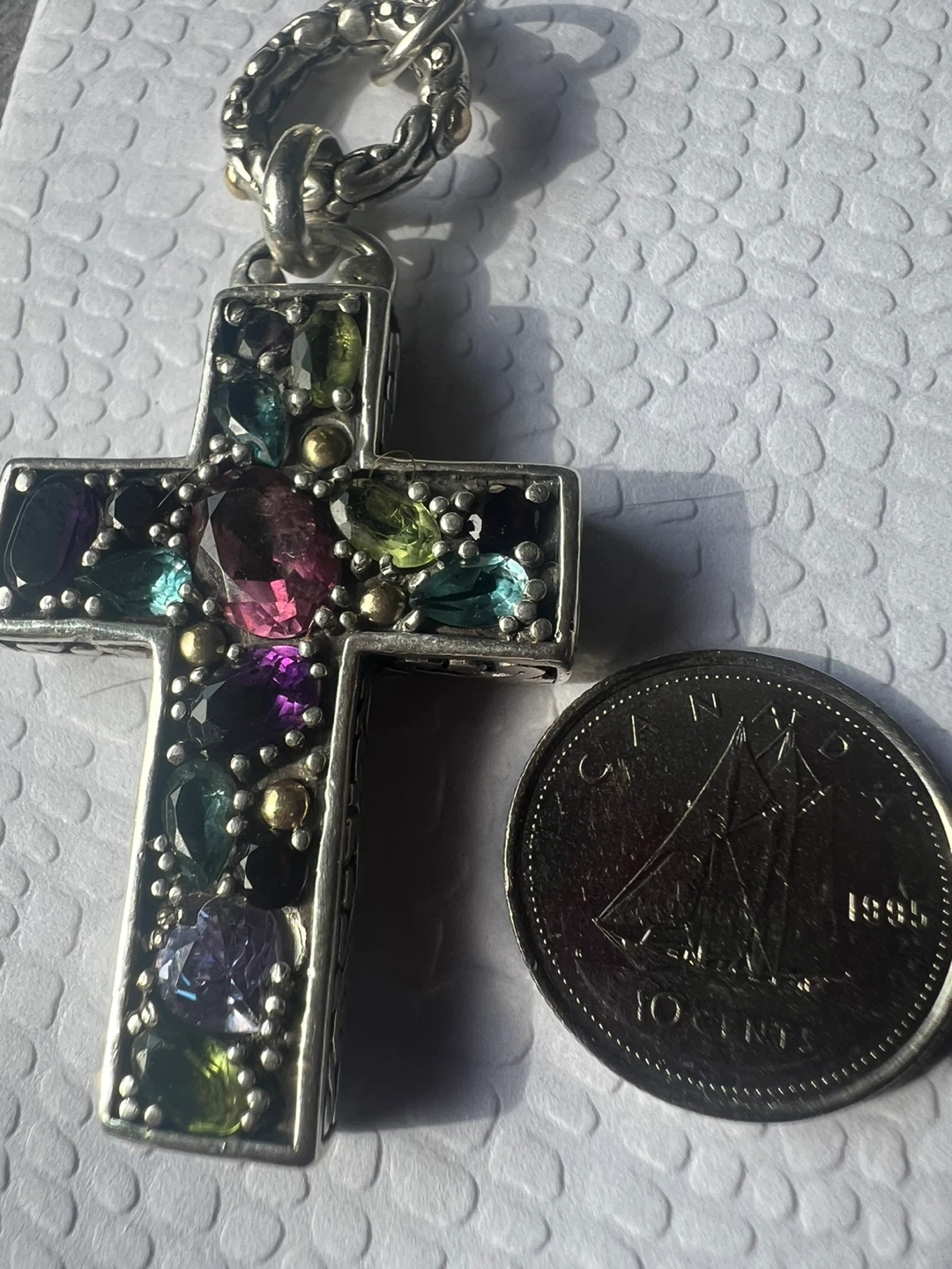 Sterling silver 925 and 18 k yellow gold cross pendant necklace with colourful gemstones. Features "Effy" branding and "925" stamp. A statement piece for any jewelry collection!