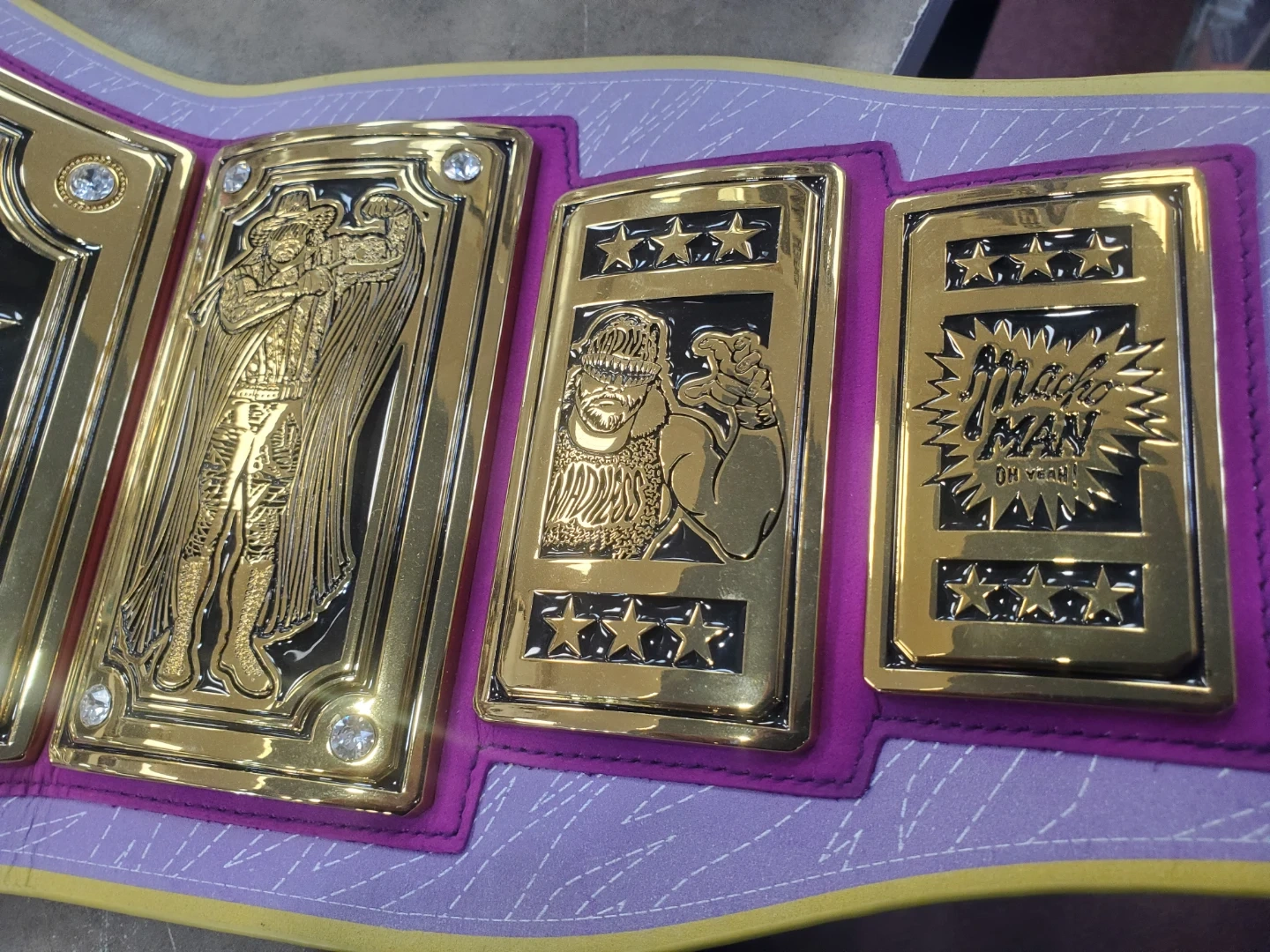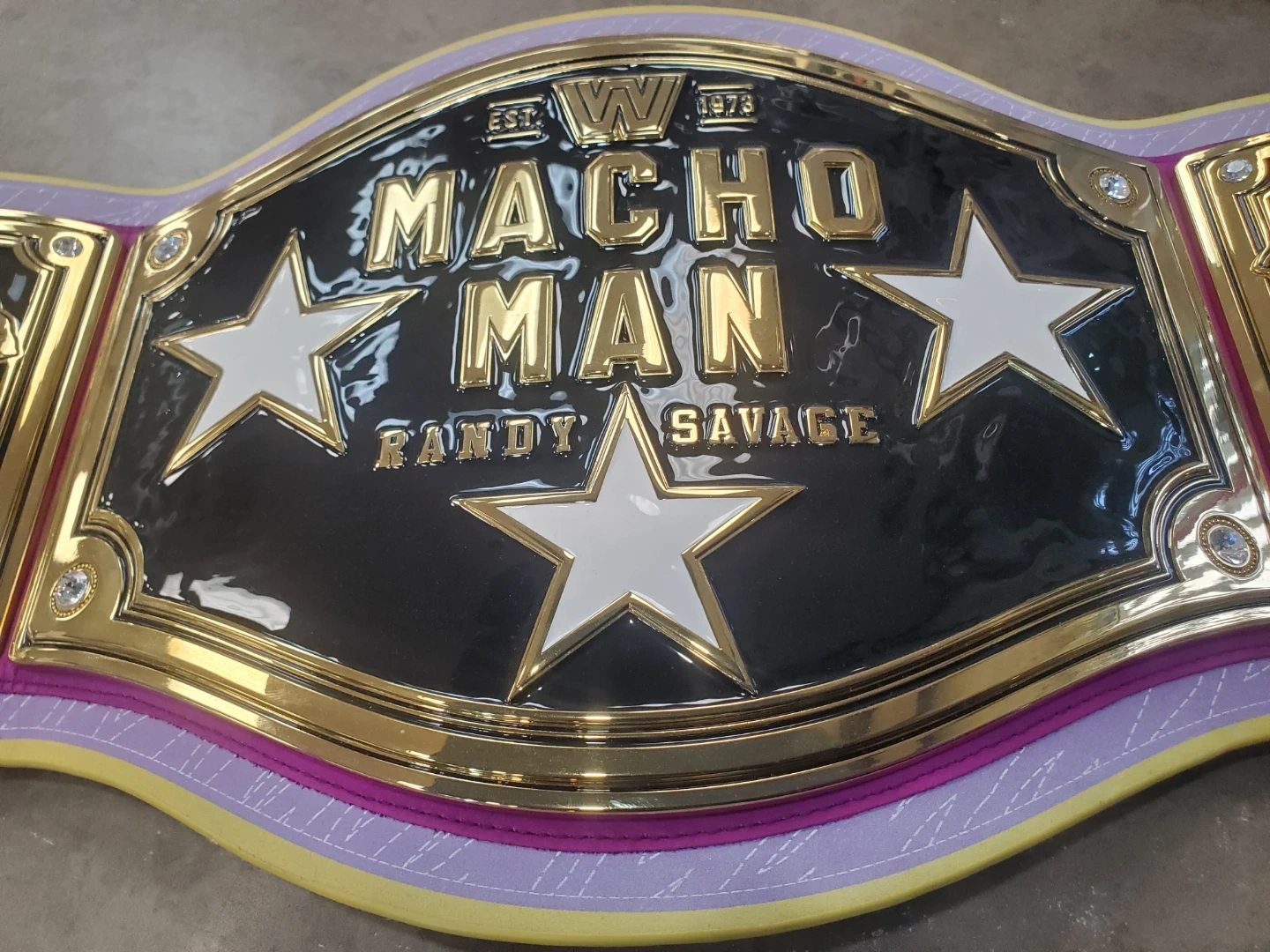 This is a replica championship belt for Macho Man Randy Savage. It features "Macho Man" and "Randy Savage" text with stars and iconic images of the wrestler. The belt has a purple and yellow strap with gold-coloured plates.