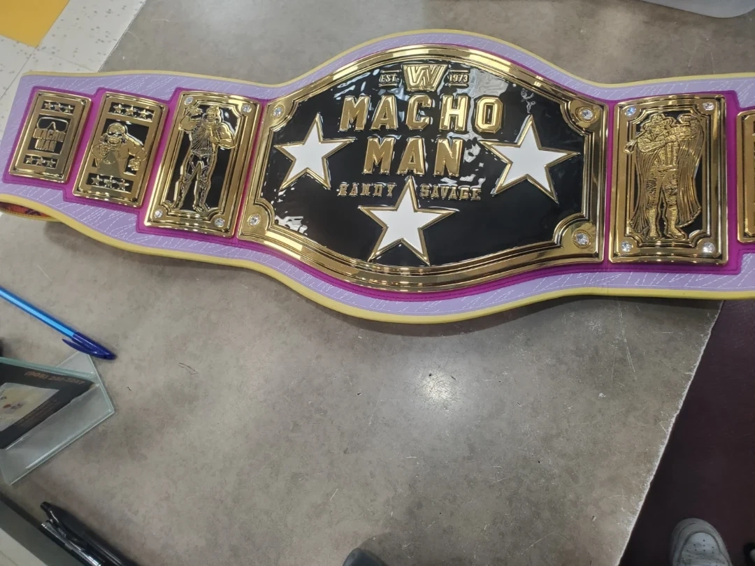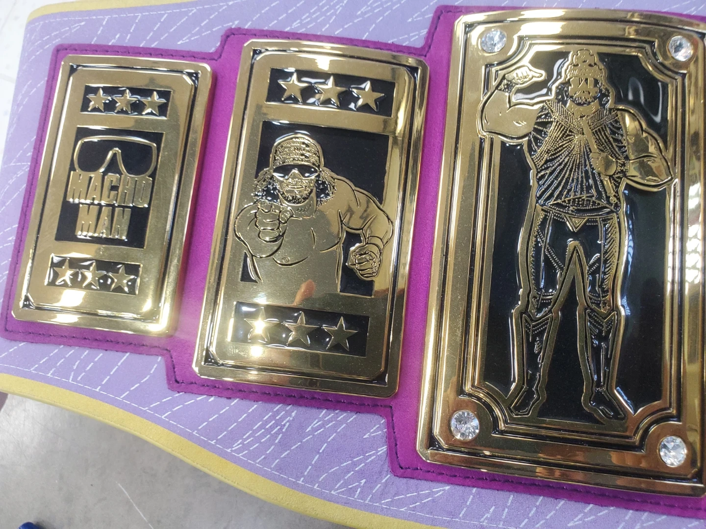 This is a replica championship belt for Macho Man Randy Savage. It features "Macho Man" and "Randy Savage" text with stars and iconic images of the wrestler. The belt has a purple and yellow strap with gold-coloured plates.
