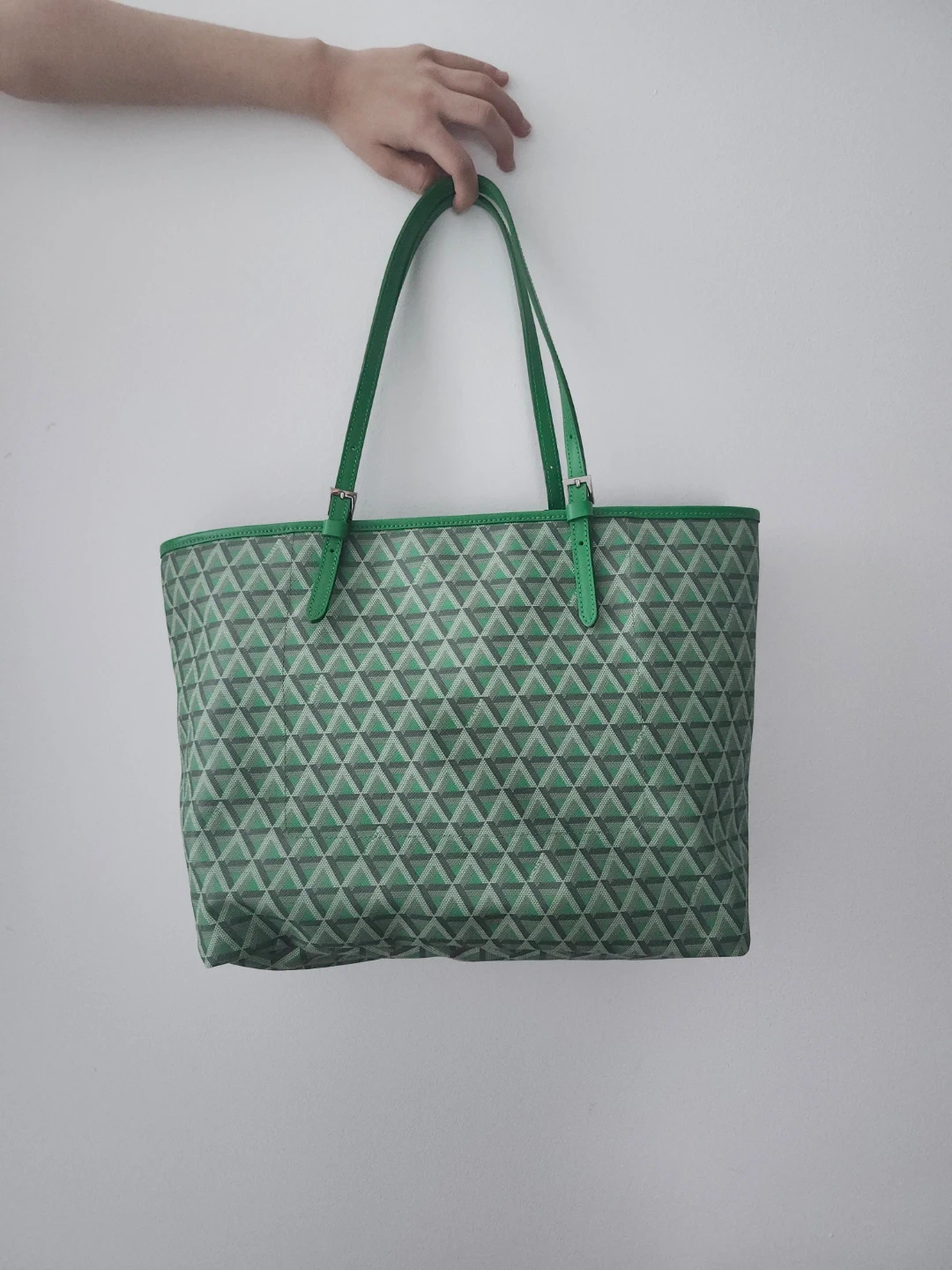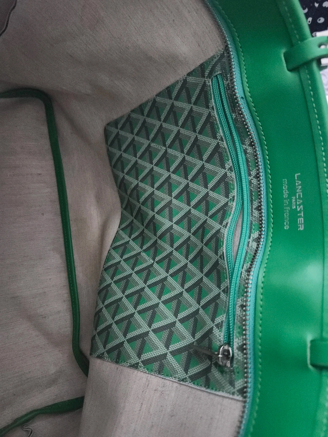 This is a Lancaster tote bag in green with a geometric pattern. It's made in France. It features a zip closure for the main compartment and an interior zip pocket.