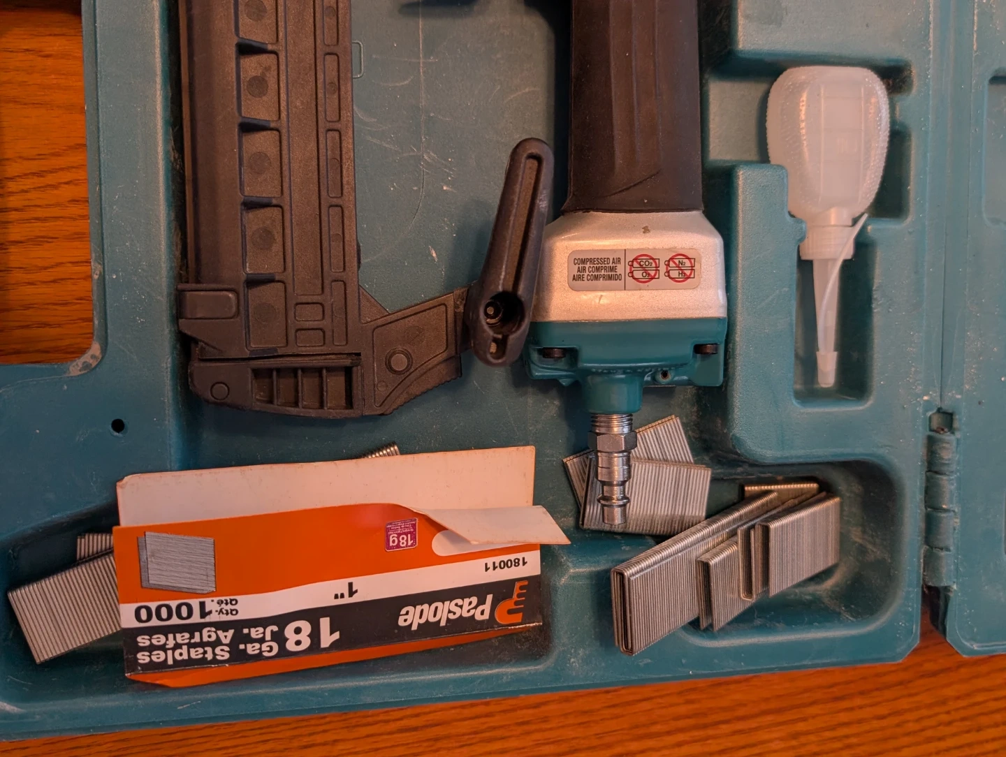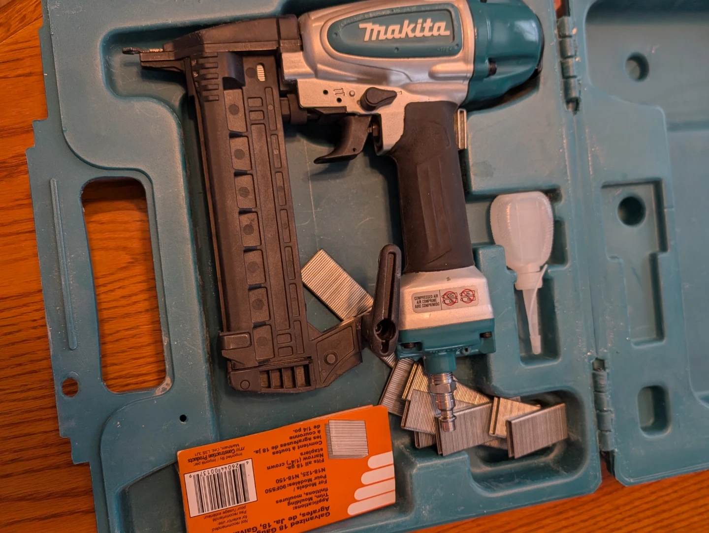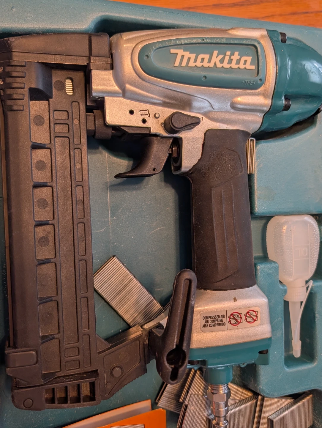 This is a Makita AT638A 1/4" Narrow Crown Stapler.