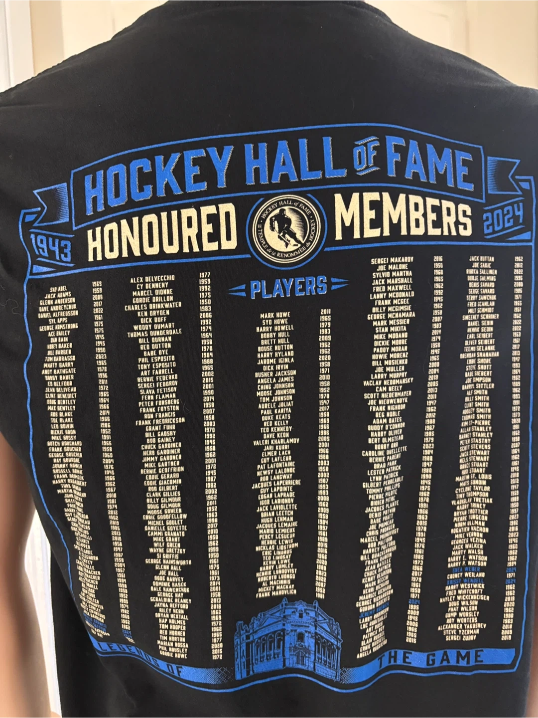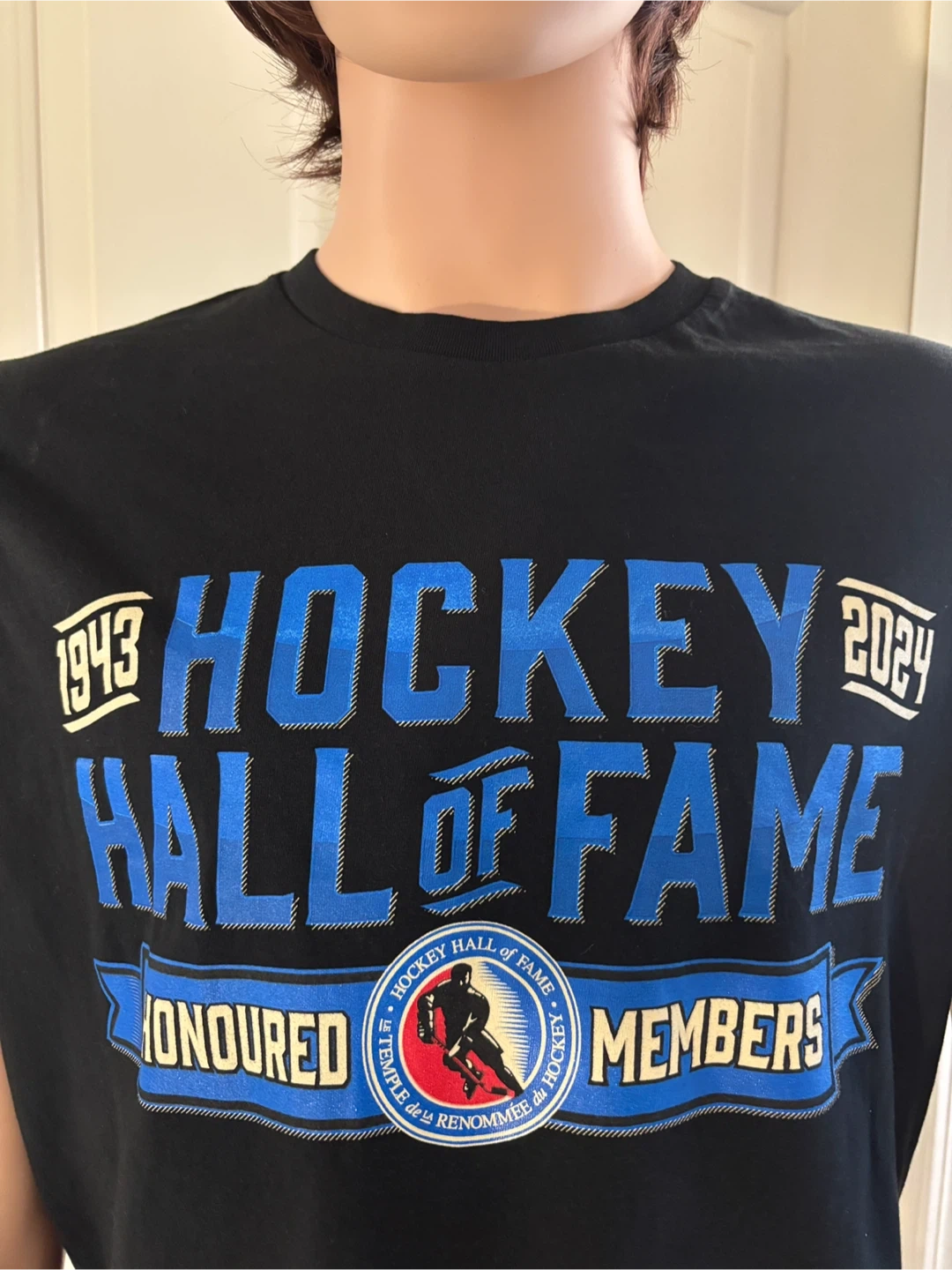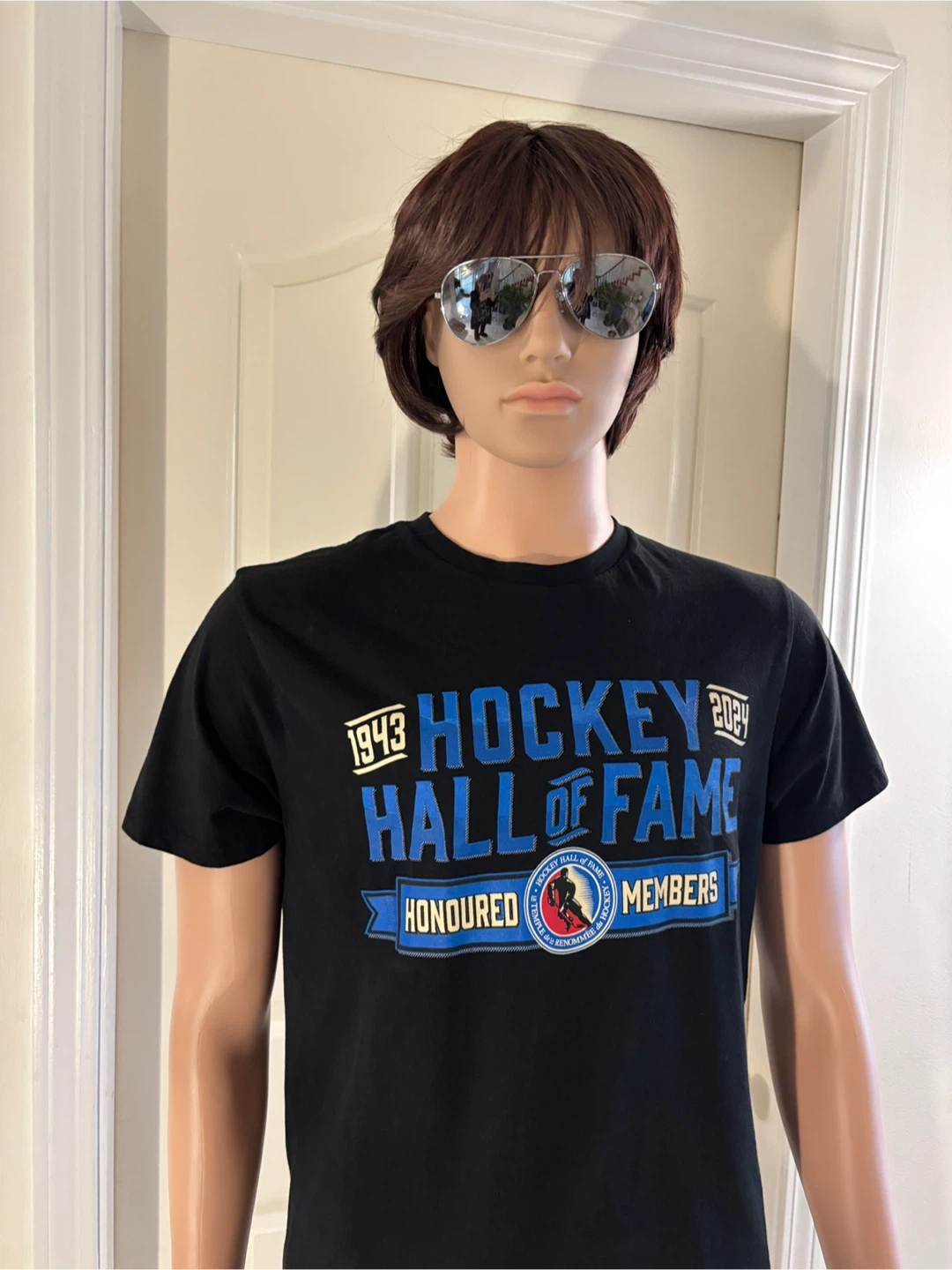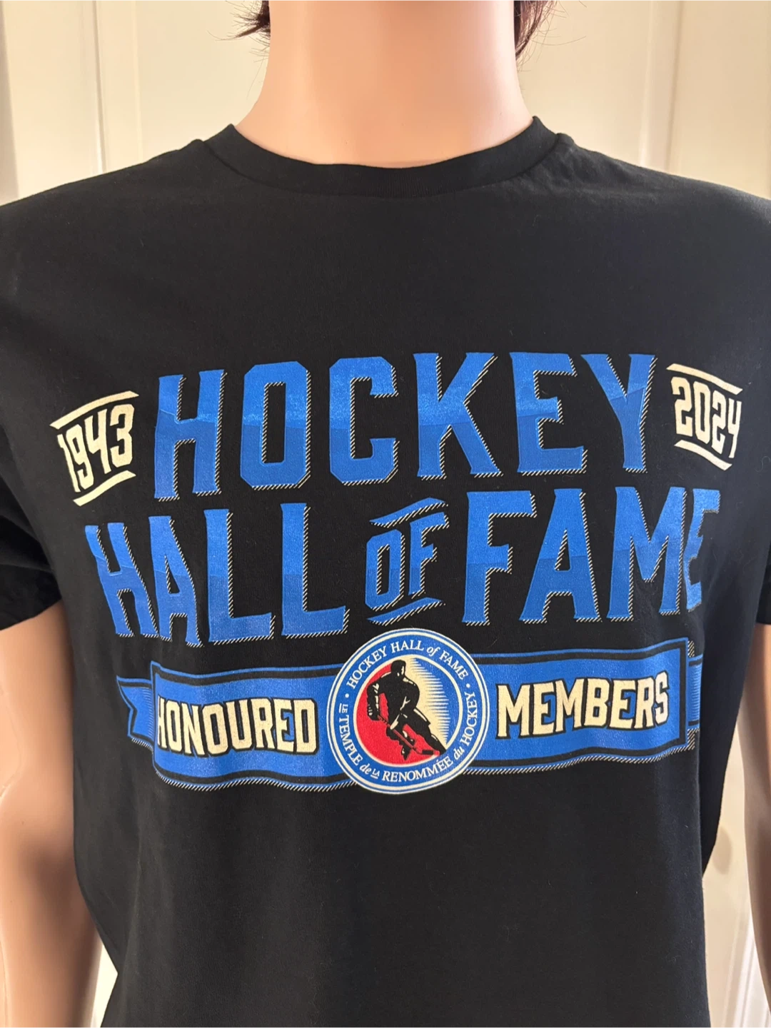 Hockey Hall of Fame commemorative t -shirt celebrating 1943 - 2024. Features honoured members listed on the back, making it a great keepsake for any true hockey fan or collector. In good condition with plenty of life left. Official Hockey Hall of Fame item.