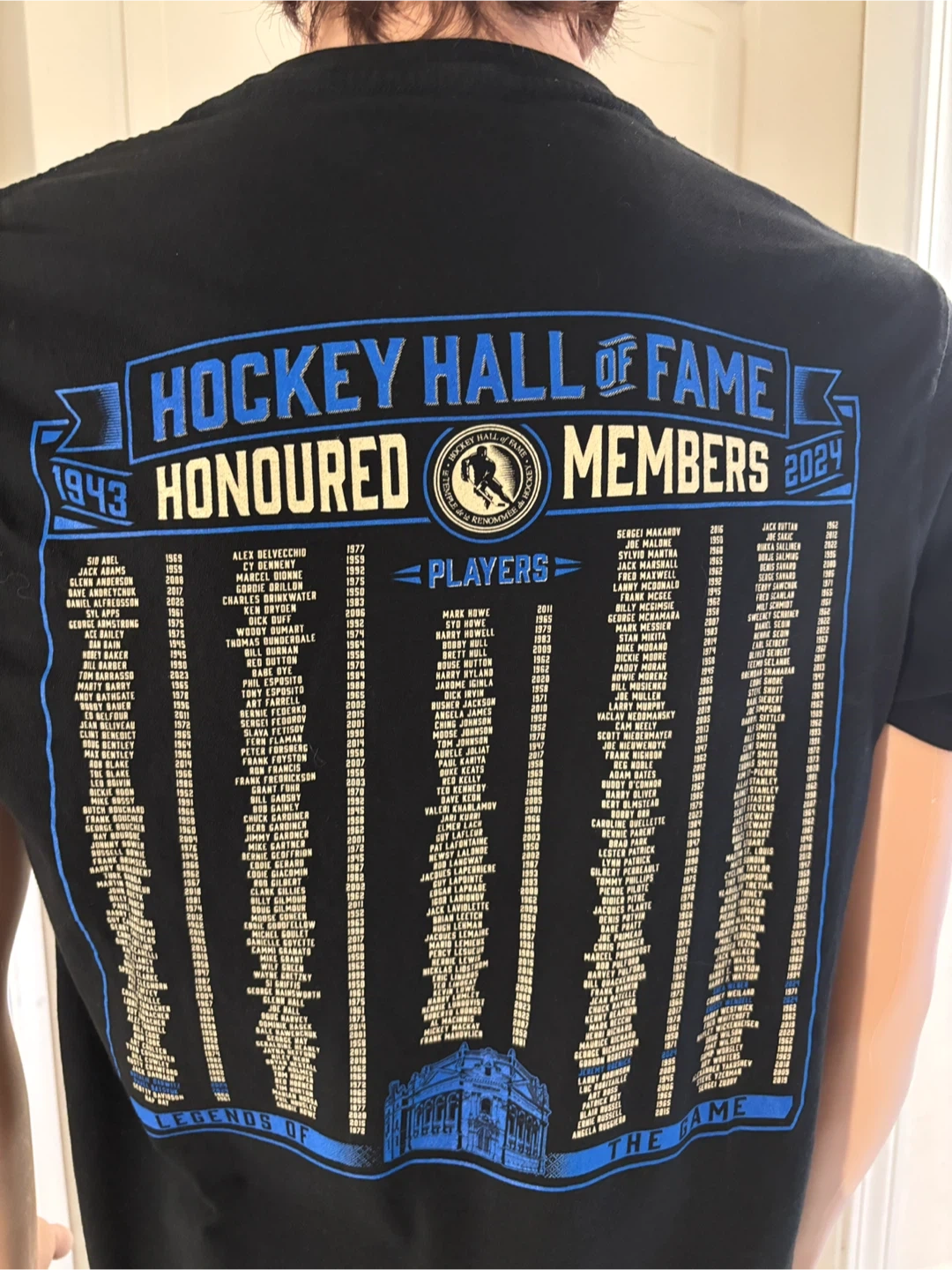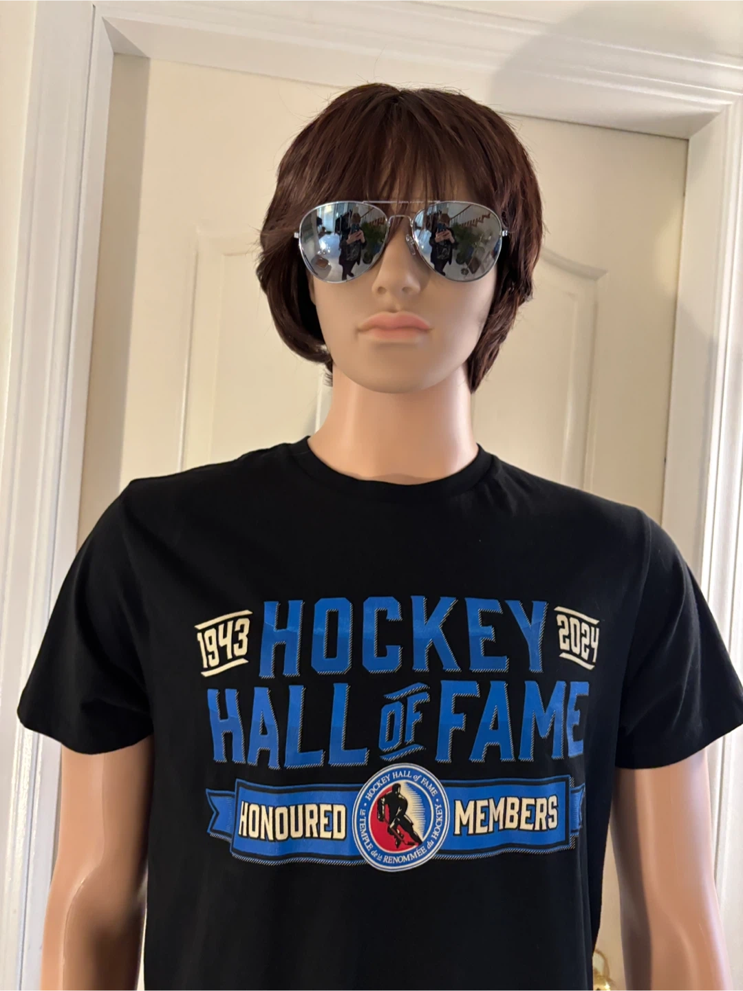 Hockey Hall of Fame commemorative t -shirt celebrating 1943 - 2024. Features honoured members listed on the back, making it a great keepsake for any true hockey fan or collector. In good condition with plenty of life left. Official Hockey Hall of Fame item.