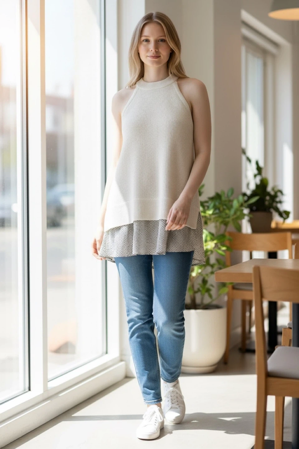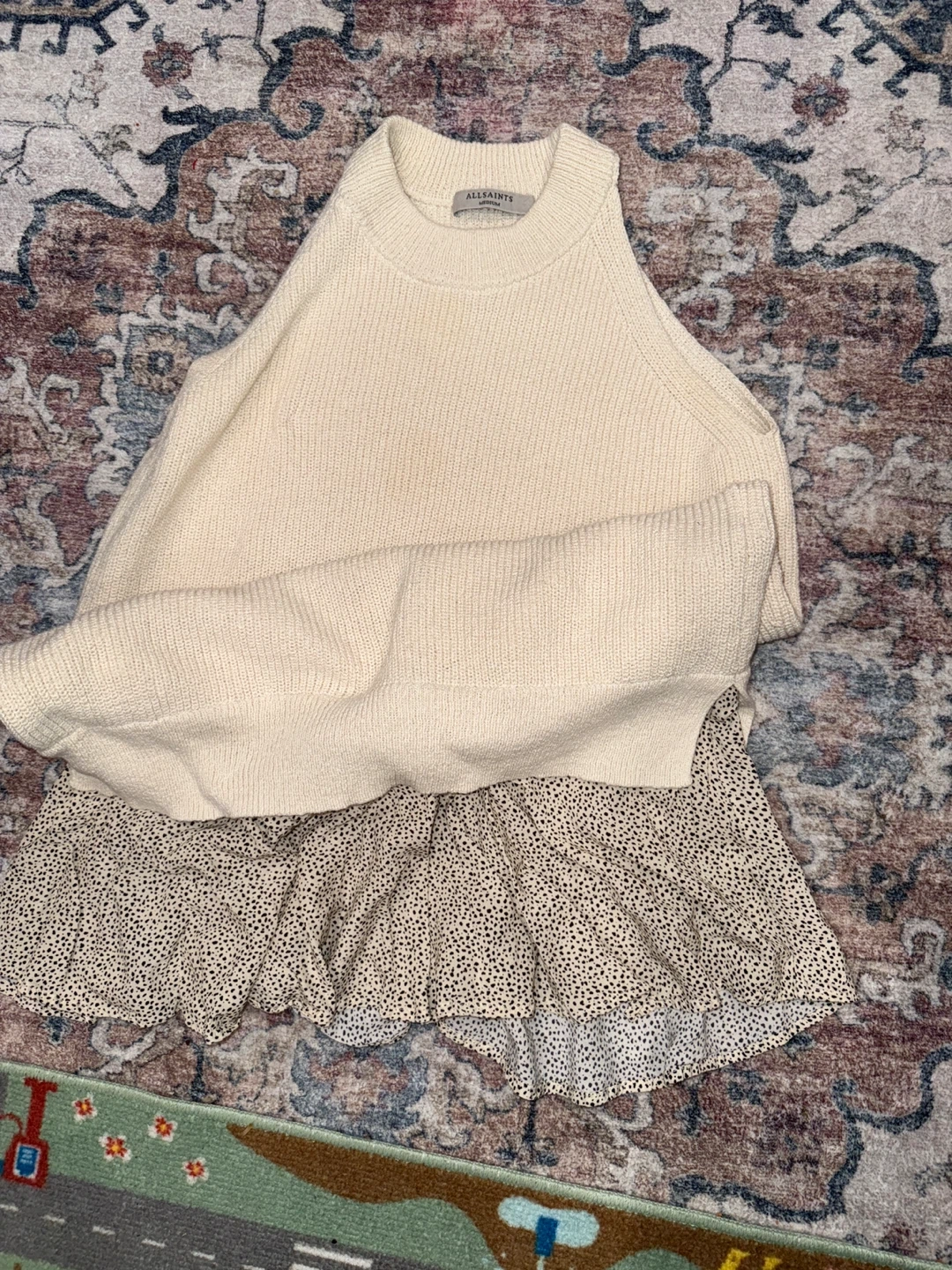 This ALLSAINTS sleeveless knit top features a cream-colored ribbed knit. It's a size medium. The top has a unique layered design with a contrasting ruffled hem that peeks out from underneath. It's perfect for a stylish, layered look!