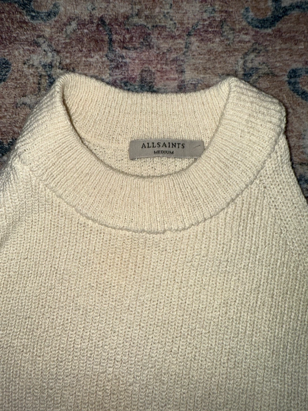 This ALLSAINTS sleeveless knit top features a cream-colored ribbed knit. It's a size medium. The top has a unique layered design with a contrasting ruffled hem that peeks out from underneath. It's perfect for a stylish, layered look!