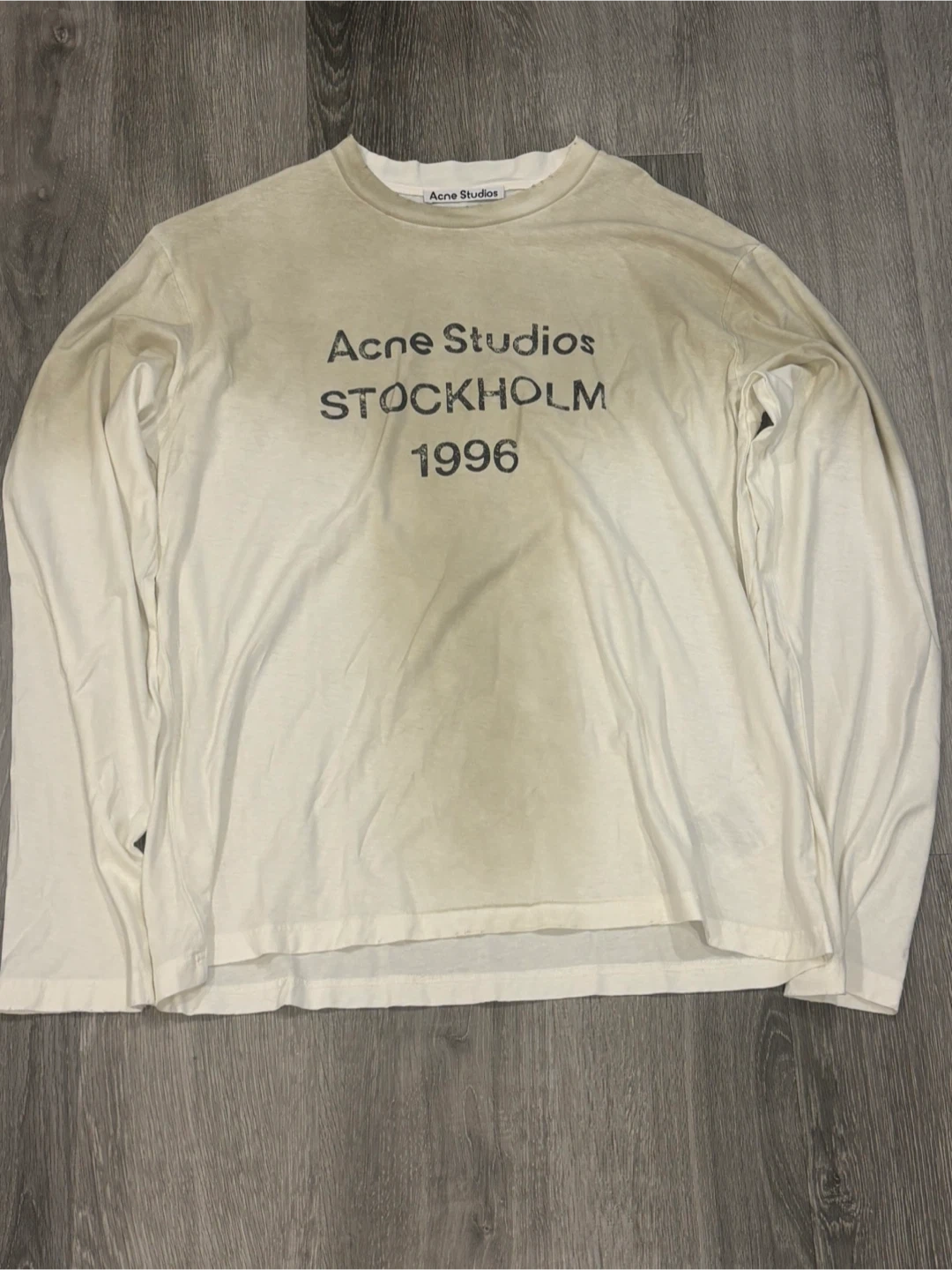 This is an Acne Studios long sleeve t-shirt with 'Stockholm 1996' graphic. It's a crew neck style. Cotton material.