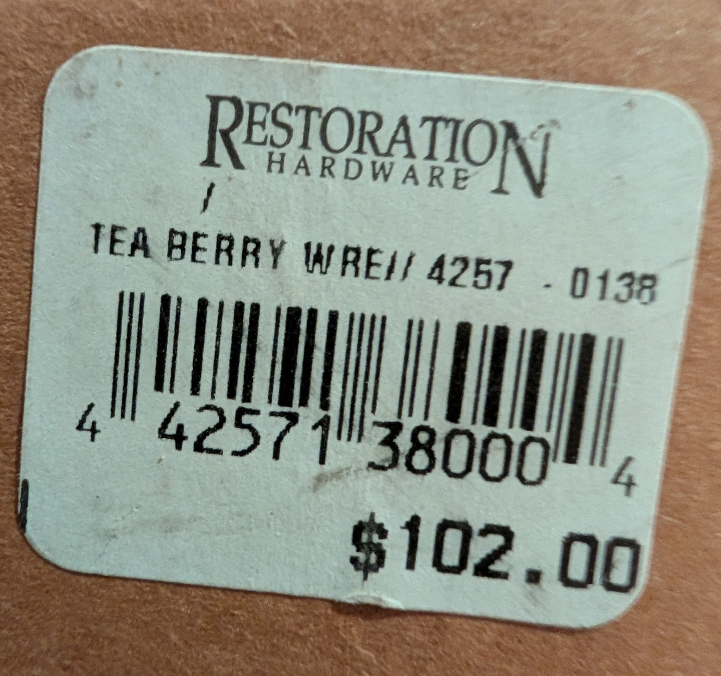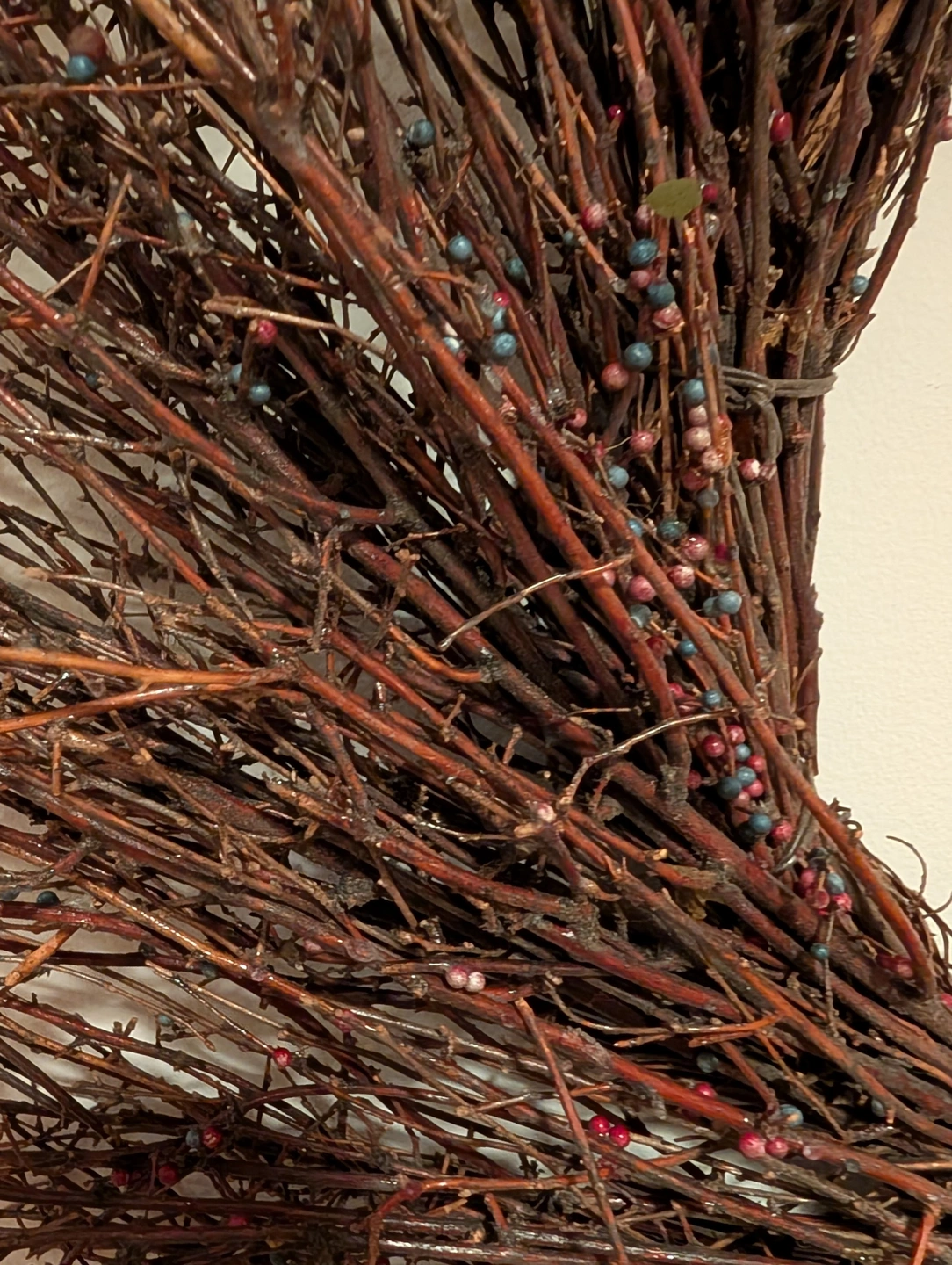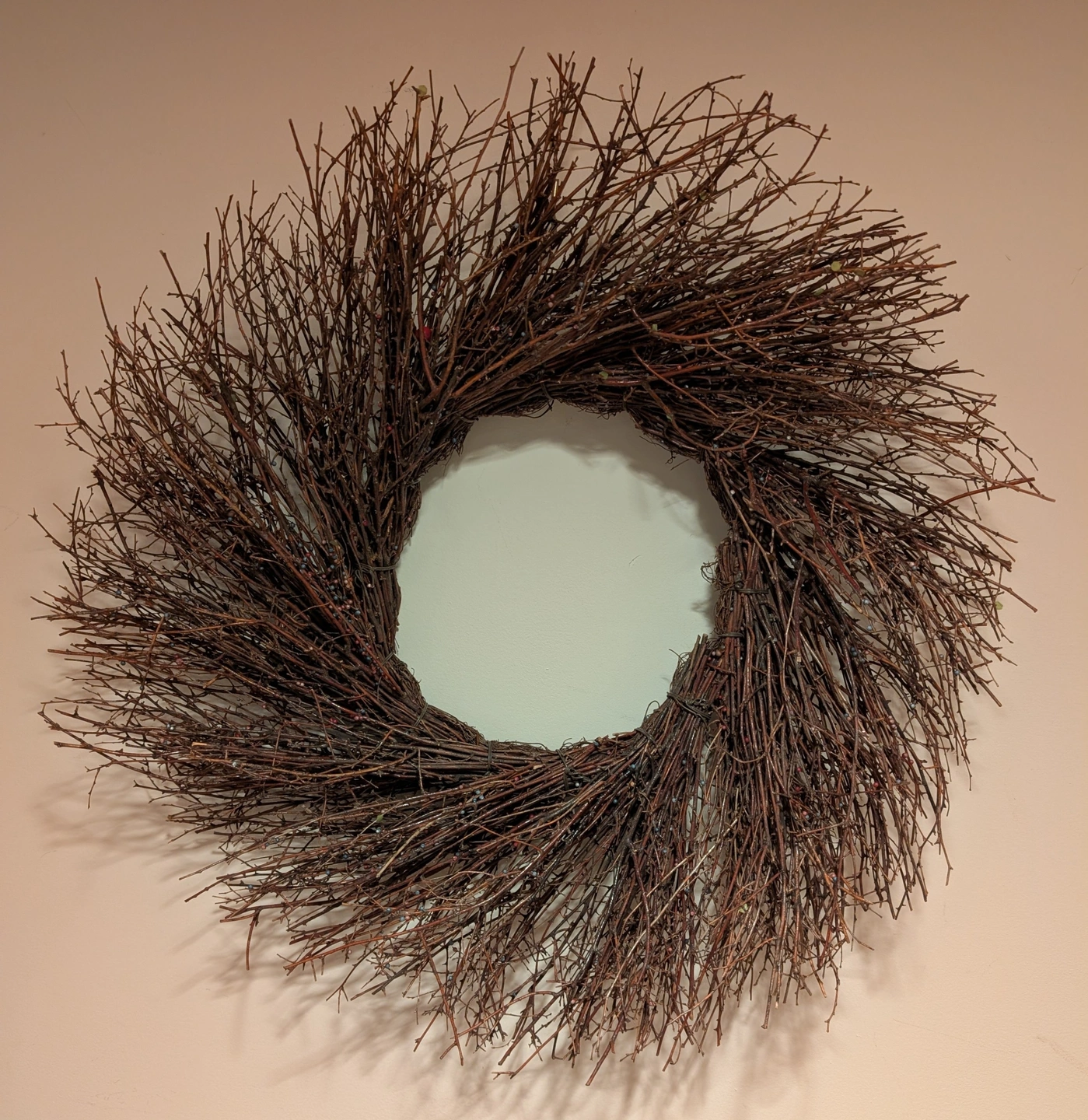 An all-season 24" tea-berry wreath from Restoration Hardware. "Woodland Twig Berry" in original box. Note that the clear plastic cover of the box is cracked but provides protection. See close-up photo for tiny berries on the twigs. Includes twine loop for hanging. Porch pick-up. Runnymede-Bloor area.