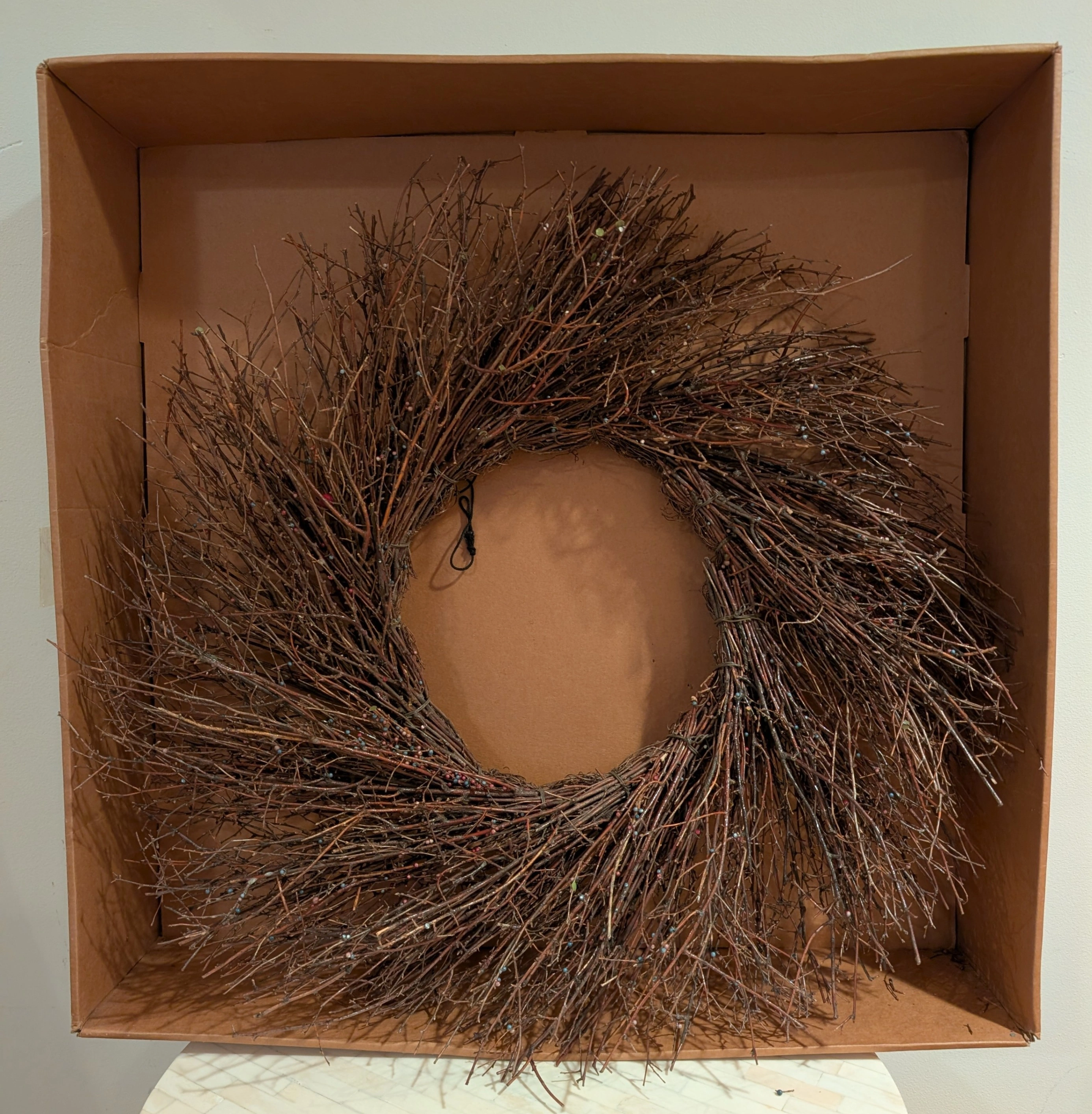 An all-season 24" tea-berry wreath from Restoration Hardware. "Woodland Twig Berry" in original box. Note that the clear plastic cover of the box is cracked but provides protection. See close-up photo for tiny berries on the twigs. Includes twine loop for hanging. Porch pick-up. Runnymede-Bloor area.